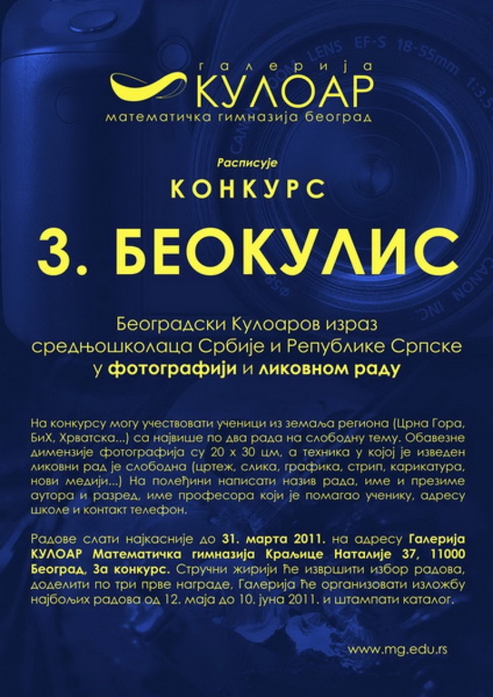 Završeni konkursi May 07, 2011 15:08Galerija KULOAR Završeni su konkursi za Likovni rad i Fotografiju učenika srednjih škola Republike Srbije. Pictures