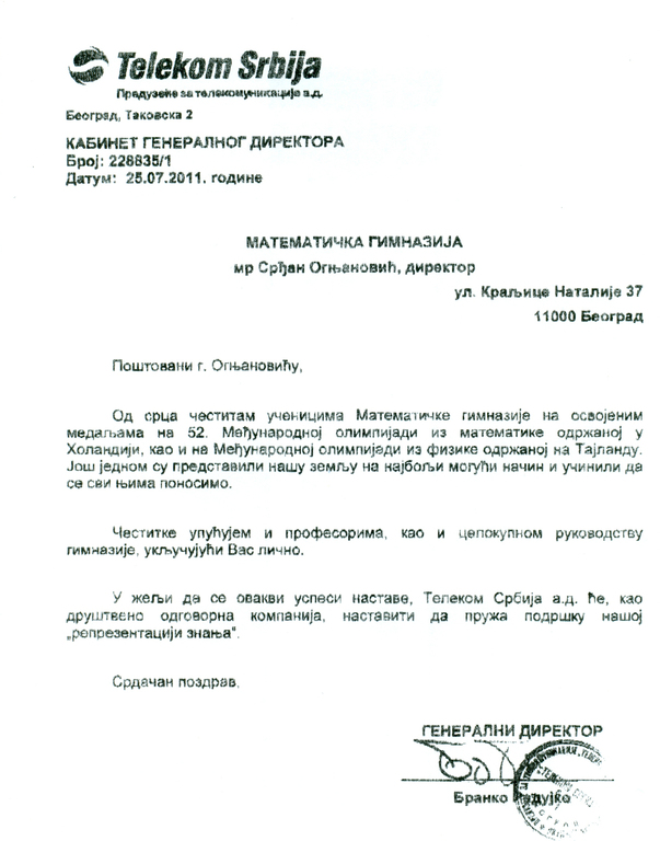 Čestitka Telekoma Srbije July 26, 2011 07:25General Telekom Srbija i generalni direktor gospodin Branko Radujko uputio je iskrene čestitke učenicima, kolektivu i direktoru Matematičke gimnazije povodom izvanrednog uspeha naših učenika na Međunarodnoj olimpijadi iz matematike. Pictures
