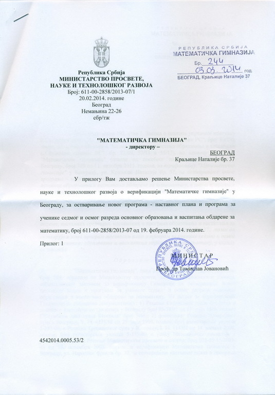 Dana, 3. marta 2014. godine Matematička gimnazija je dobila Rešenje Ministarstva prosvete, nauke i tehnološkog razvoja o verifikaciji Matematičke gimnazije za ostvarivanje nastavnog plana i programa za učenike sedmog i osmog razreda osnovnog obrazovanja i vaspitanja obdarene za matematiku.