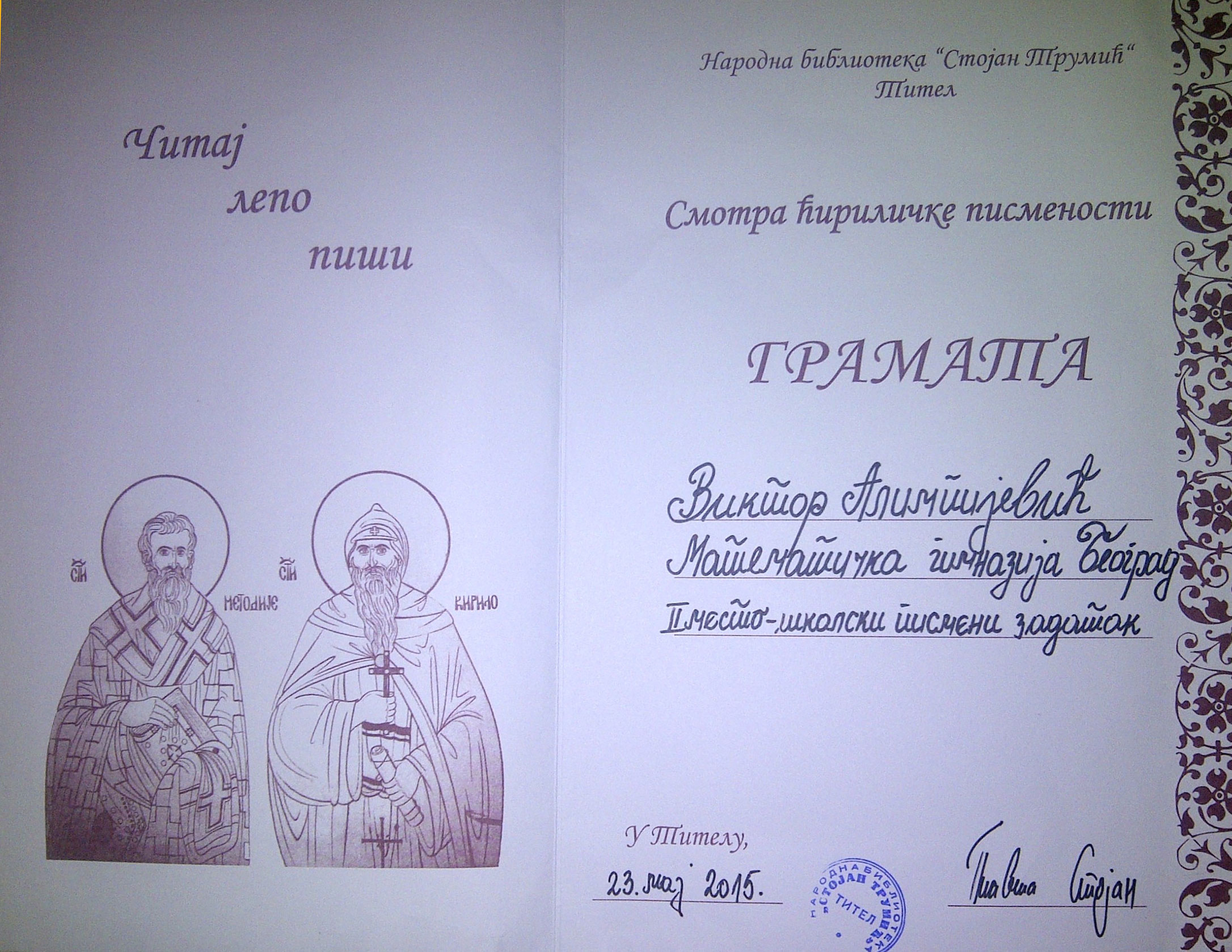 На 13. Смотри ћириличке писмености Читај лепо пиши 2015 одржаној у Народној библиотеци у Тителу Виктор Алимпијевић (3ц) освојио је ДРУГУ награду за најбољи писмени задатак. Виктор је добио награда за свој први писмени задатак, а његов рад можете прочитати у прилогу. Честитке Виктору, освојио је сјајно признање у области литерарне писмености!