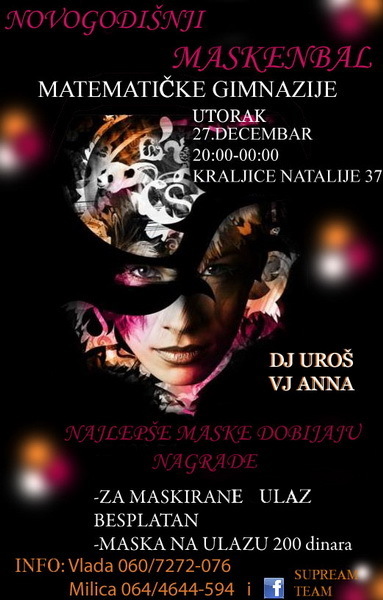 ОпштеУ уторак, 27. децембра 2011. године у 20 часова почиње Новогодишњи маскенбал ученика Математичке гимназије. За најлепше маске су припремљене награде. Улаз је бесплатан за маскиране, док цена маске на улазу износи 200 динара.