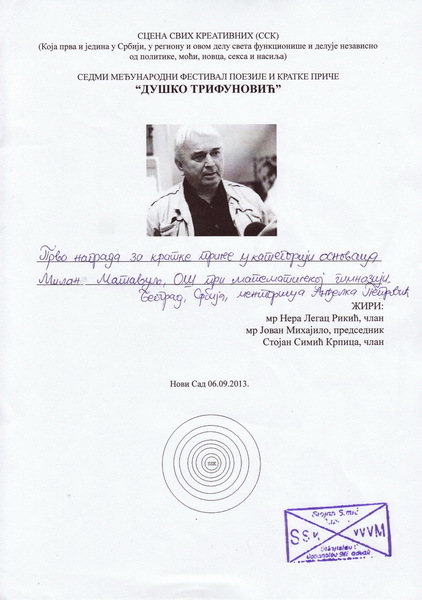 ОпштеНа Седмом међународном фестивалу поезије и кратке приче „Душко Трифуновић“ ученици Математичке гимназије су заблистали. Кратка прича основца Милана Матавуља под називом „Прича о одрастању“ освојила је ПРВУ награду у категорији основаца. Ментор: професорка Анђелка Петровић. Миланову причу можете прочитати овде. Кратке приче матуранткиње Тамаре Радивојевић под називом „Прича старог ораха“, „Мрак“ и „Деца будућности“ освојиле су ТРЕЋУ награду и то у категорији писаца до 30 година. Ментор: професорка Душица Антанасковић. Тамарину причу можете прочитати овде.