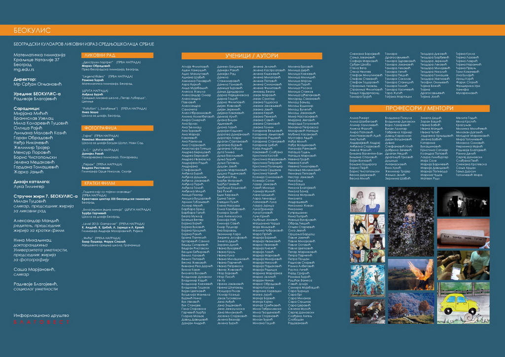ОпштеГалерија КУЛОАРПобедници 7 .БЕОКУЛИС-а (Београдски Кулоаров ликовни израз средњошколаца Србије) галерије Кулоар Математичке гимназије из Београда и галерије Уроборос, су за ликовни рад Марко Обрадовић Прва београдска гимназија, Београд и Рамона Ђурић Математичка гимназија, Београд, за фотографију: Немања Миленковић, Школа за дизајн Богдан Шупут, Нови Сад, a за кратак филм - Креативни центар XIII београдске гимназије, Београд.