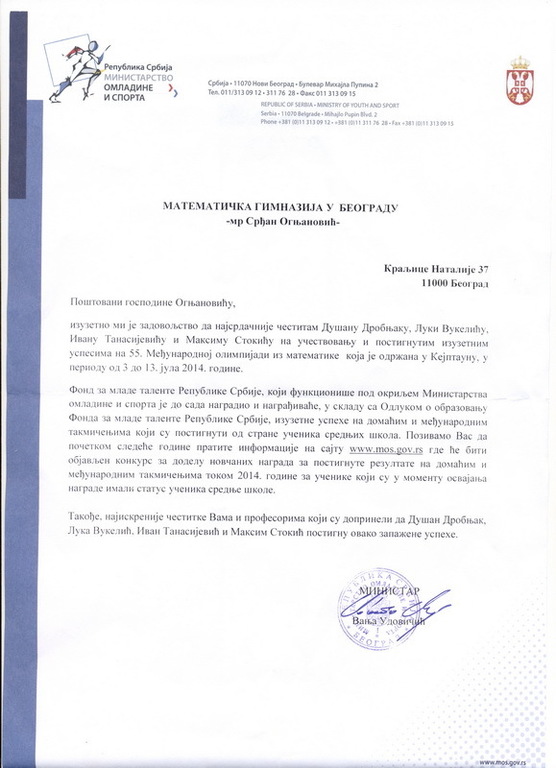 ОпштеМинистар омладине и спорта господин Вања Удовичић упутио је честитку Душану Дробњаку, Луки Вукелићу, Ивану Танасијевићу и Максиму Стокићу на изузетним успесима које су постигли на Међународној олимпијади из математике која је одржана у Јужноафричкој Републици. Такође, упутио је искрене честитке директору и професорима Математичке гимназије.