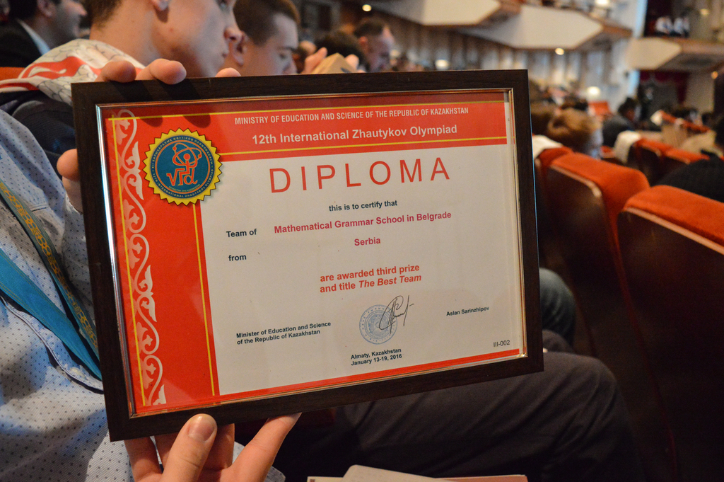 ОпштеМеђународна Жаутиковска олимпијада из математике, физике и информатике одржана је у Казахстану од 13. до 19. јануара 2016. године. На такмичењу је учествовало 450 такмичара из 19 држава (Русија, Казахстан, Румунија, Бугарска, Украјина...). И ове године Математичка гимназија је добила позив да учествује на овом такмичењу. На такмичење је отпутовало седам ученика и два професора Математичке гимназије. Наши ученици су освојили шест медаља и то три златне, једну сребрну и две бронзане медаље: