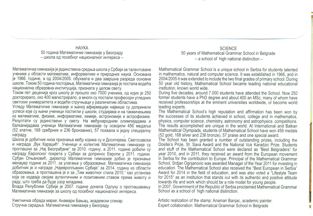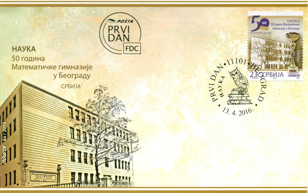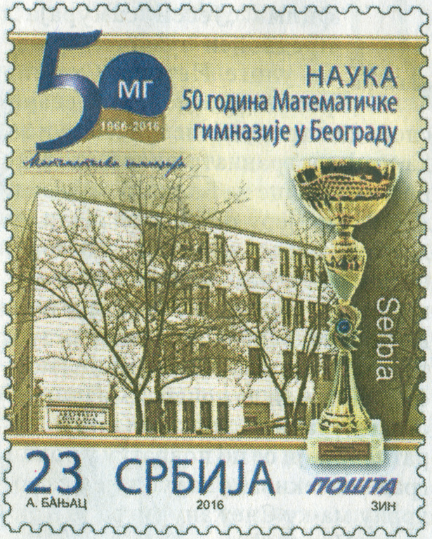ОпштеВелики јубилеј, педесетогодишњицу Математичке гимназије обележила је и "ПОШТА Србије" пригодном поштанском марком у оквиру издања "Наука". Аутор ликовног решења је Анамари Бањац, а марка има номиналу од 23 динара. Израђена је у Заводу за израду новчаница и кованог новца у техници вишебојног офсета. Уз марку је објављен и пригодни коверат.
