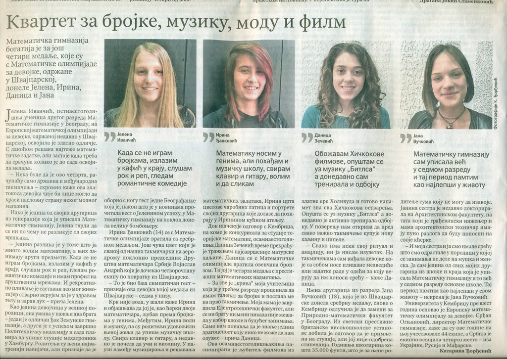 ОпштеУ листу Политика, 25. априлa 2017. године изашао је чланак о нашим дивним девојкама које су освојиле медаље на Европској математичкој олимпијади за девојке која се одржала од 6. до 12. априла у Цириху.