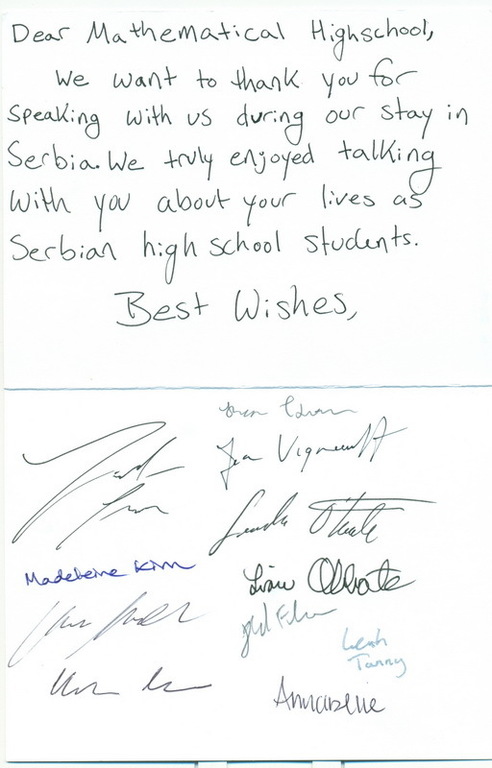 ОпштеСрдачни поздрави, приспели недавно до нас љубазним посредством г-ђе Џин Линехан и особља библиотеке Амерички кутак, подсетили су нас на један мартовски сусрет. Сусрели смо се са вршњацима из средње школе Хановер, из истоименог града у држави Њу Хемпшир, САД. Њих дванаесторо, у пратњи три професорке, посетили су наш град и радознало га упознавали у току свог боравка. Ми смо се потрудили да будемо добри домаћини и да, кроз похваљену комуникацију на енглеском језику, нашим новостеченим пријатељима приближимо аспекте нашег образовања и културе. Сусрет је обележила спонтаност и добра атмосфера, и ми верујемо да би такав утисак уобличио и сваки наш нови сусрет.