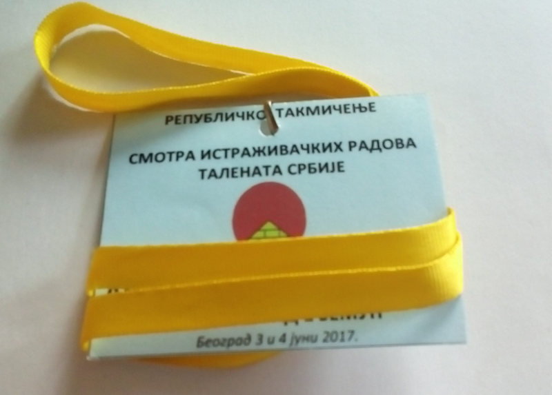 ОпштеУ суботу и недељу (3. и 4. јуна) одржано је Републичко такмичење и смотра истраживачких радова у организацији Републичког центра за таленте и Министарства просвете. Учествовало је 510 ученика, од тога дванаесторо из наше школе. Награде су освојили: Ивановић Јелена 2.б (1. место – математика), Богојевић Селена 2.а (2. место – математика), Авакумовић Ана 1.а и Рајачић Димитрије 2.ц (3. место – математика), Миа Мијовић 3.д (3. место – физика), Ђорђевић Стефан 4.д и Милисављевић Андреј 1.ц (3. место – информатика). Честитамо свим учесницима на пласману и наградама.