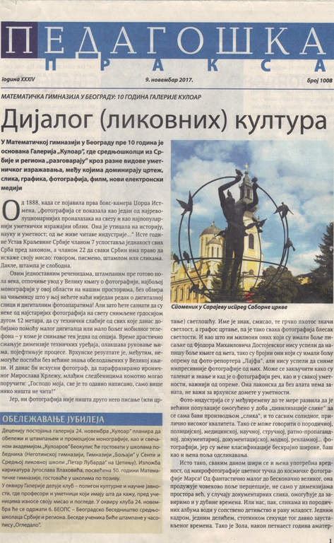 Просветни преглед09. новембар 2017. 00:00:00Галерија КУЛОАРТекст професора Радивоја Благојевића у Просветном прегледу. Слике