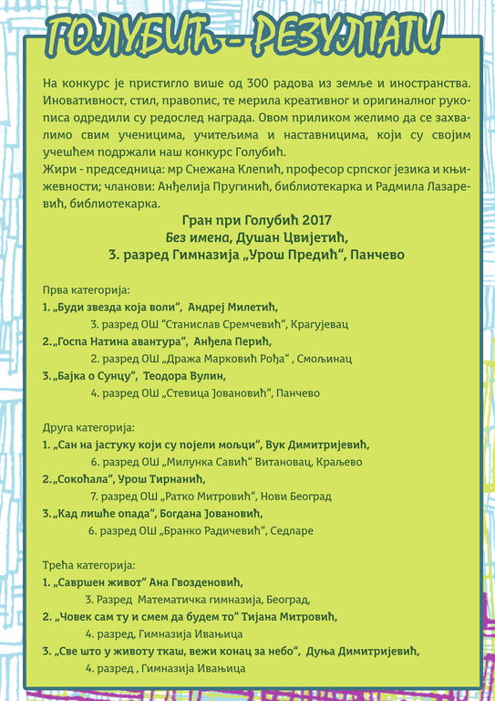 ОпштеГрадска библиотека ”Карло Бјелицки” из Сомбора и 2017. године организовала је децембарске XI Вељкове дане, у знак сећања на писца Вељка Петровића. Тим поводом расписан је и литерарни конкурс за ученике основних и средњих школа. На конкурс је пристигло више од 300 радова из земље и иностранства. Ученица 3ц Ана Гвозденовић освојила је прву награду за кратку причу под насловом ”Савршени живот” (ментор: Анђелка Миладиновић, професорка српског језика и књижевности). Жири је оцењивао иновативност, стил, правопис, као и мерила креативног и оригиналног рукописа. Честитке за Ану и сјајан успех којим је још једном показала да се ученици Математичке гимназије диче најраскошнијим талентима.