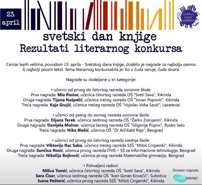 ОпштеУченица 1ц одељења Николија Бојковић освојила је још једну литерарну награду. Овај пут у питању је литерарни конкурс који организује Центар лепих вештина из Кикинде, а поводом Светског дана књиге, који се обележава 23. априла. Николија је писала прозни рад на тему Ко у чуда верује, чуда ствара и освојила је трећу награду. Честитамо Николији!