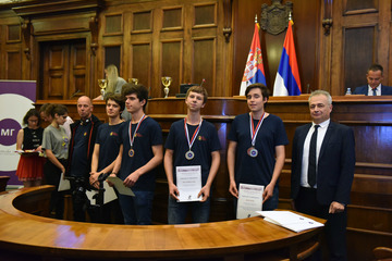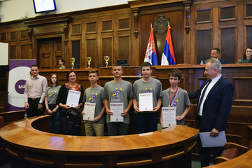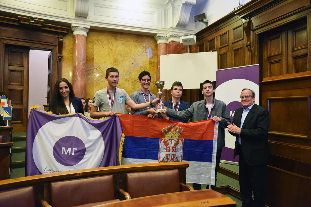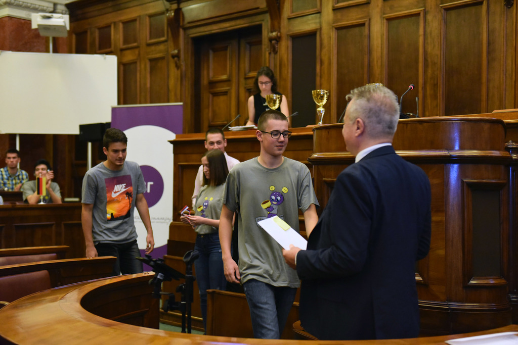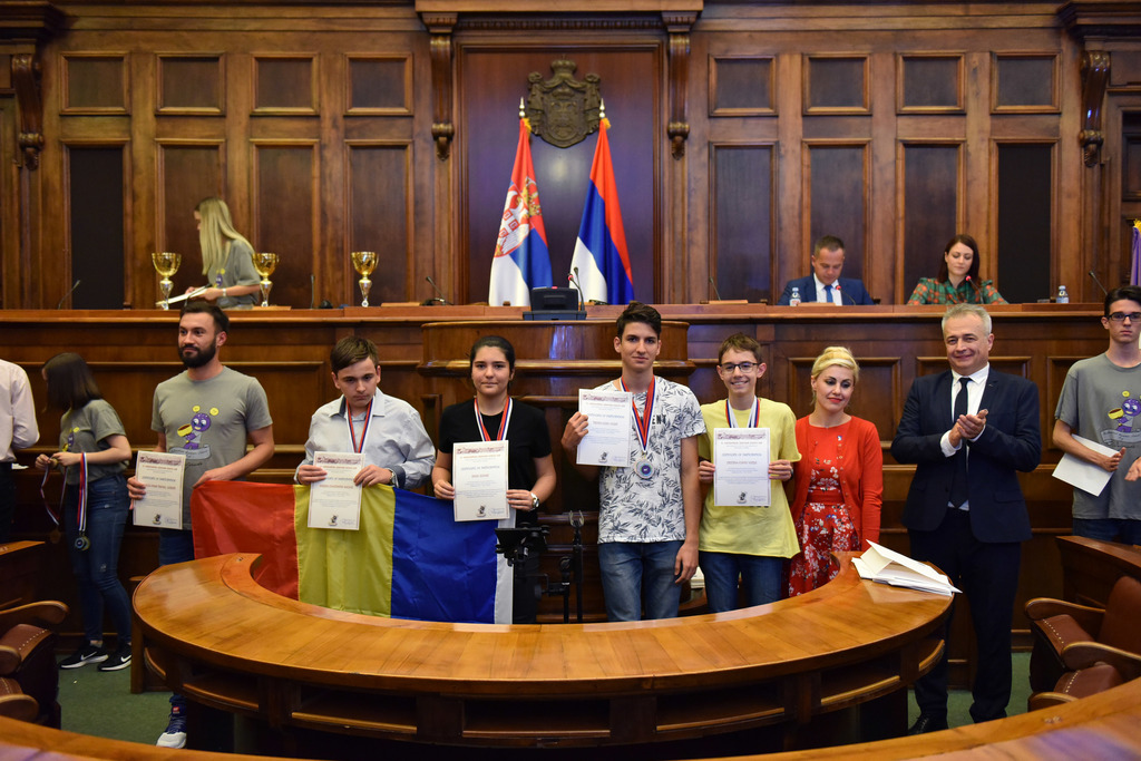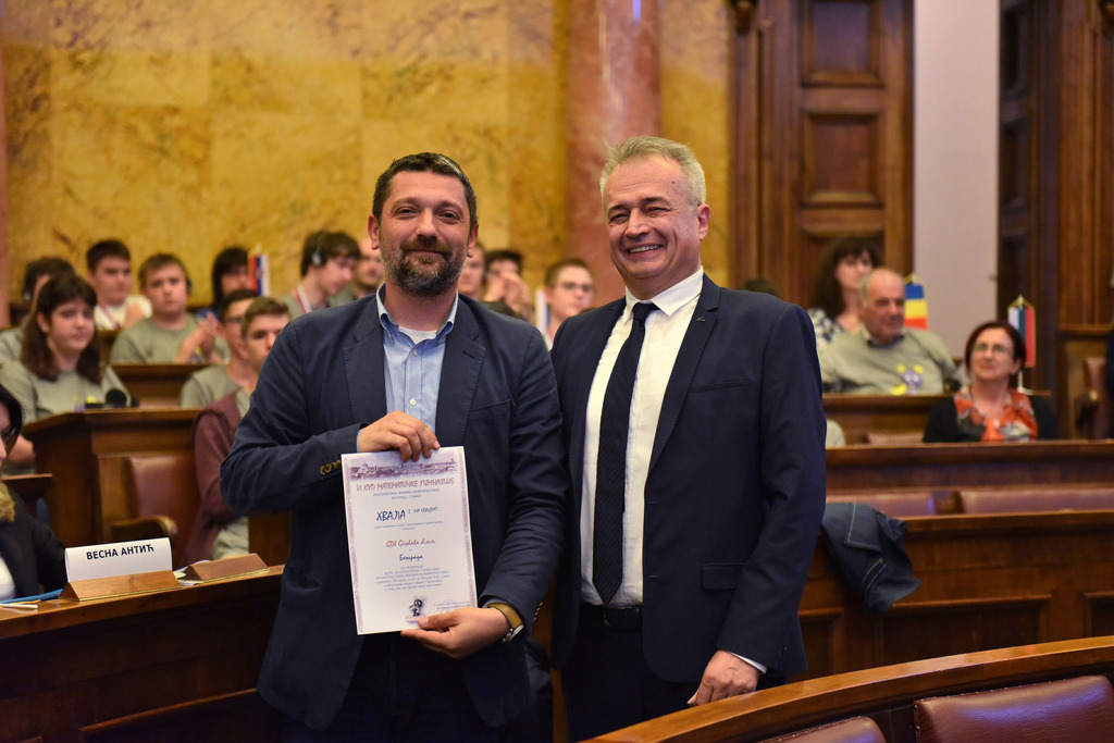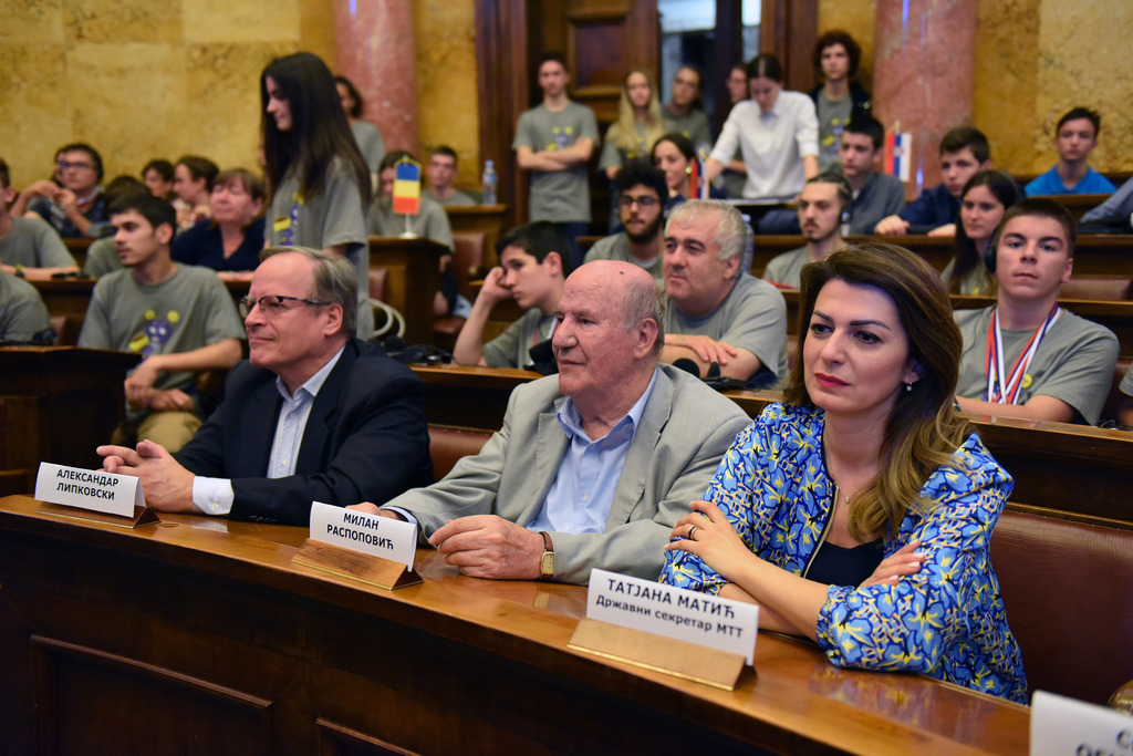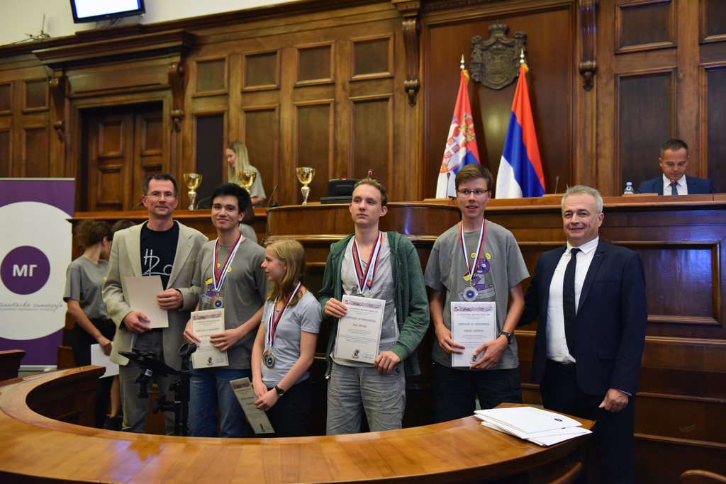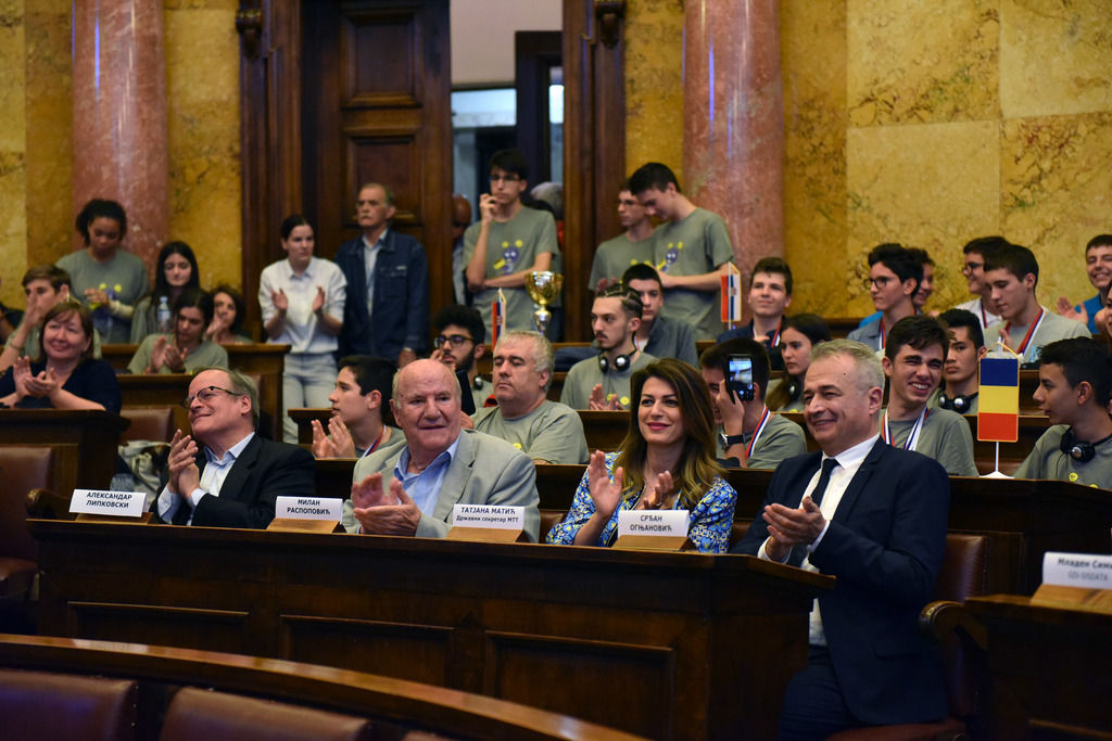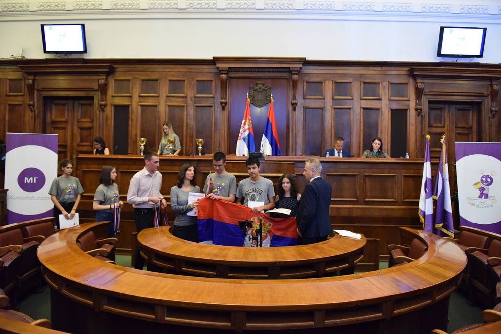ОпштеМЕЂУНАРОДНА ТАКМИЧЕЊА-фотографијеУ четвртак, 28. јуна 2018. године у Народној скупштини Републике Србије свечано је затворен шести Куп Математичке гимназије. Гостима се обратио директор Срђан Огњановић и госпођа Татјана Матић, државни секретар у Министарству трговине, туризма и телекомуникација, која годинама показује велико разумевање за нашу школу и ову манифестацију. Министарство трговине, туризма и телекомуникација је један од покровитеља Купа, а ове године је и финансијски помогло да се ово такмчење организује. На свечаном затварању подељене су медеље најуспешнијим такмичарима и пехари најуспешнијим тимовима. Најуспешнији тим у области информатике је тим Румунија-4, најуспешнији тим у области физике је тим Русија-1, а најуспешнији тим у области математике је тим Србија-3, састављен од ученика првог разреда МГ. Фирма GDI је спонзорисала награде за три најуспешнија такмичара. Господин Нинослав Митрић, директор GDI уручио је три Самсунг таблета Страхињи Гроздићу (из тима Србија-3, најбољи такмичар у области математике), Михаилу Лебкову (из тима Русија-1, најбољи такмичар у области физике) и Лаури Нани-Руксандри (из тима Румунија-4, најбоља такмичарка у области информатике).