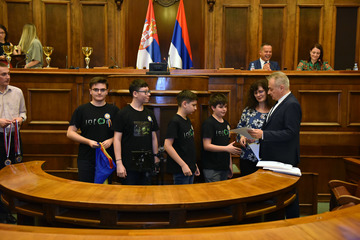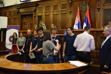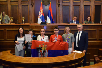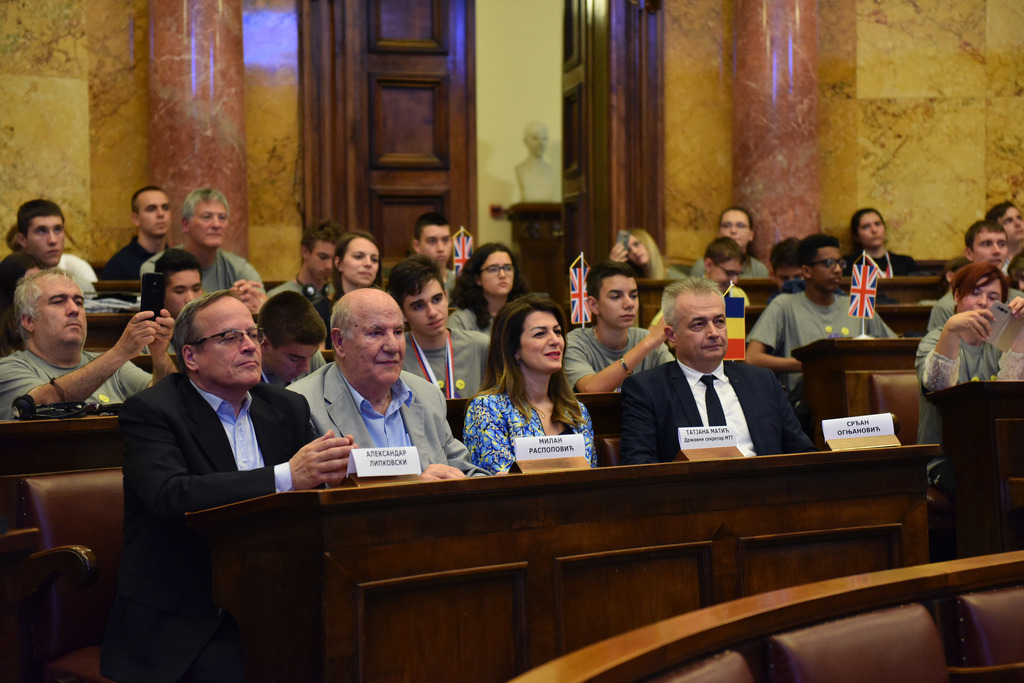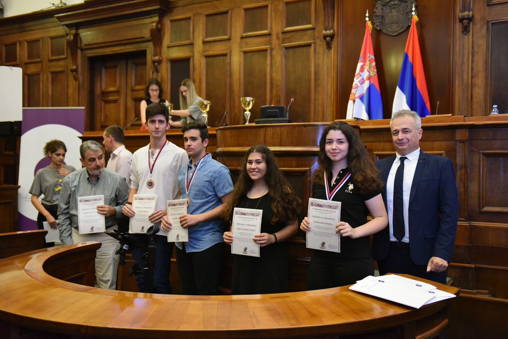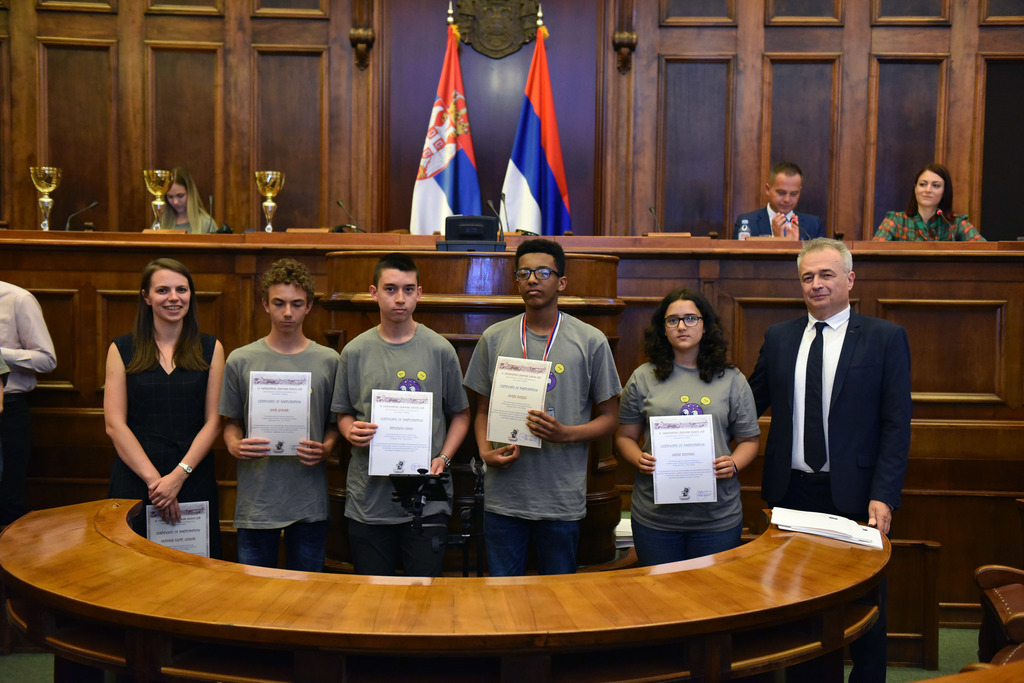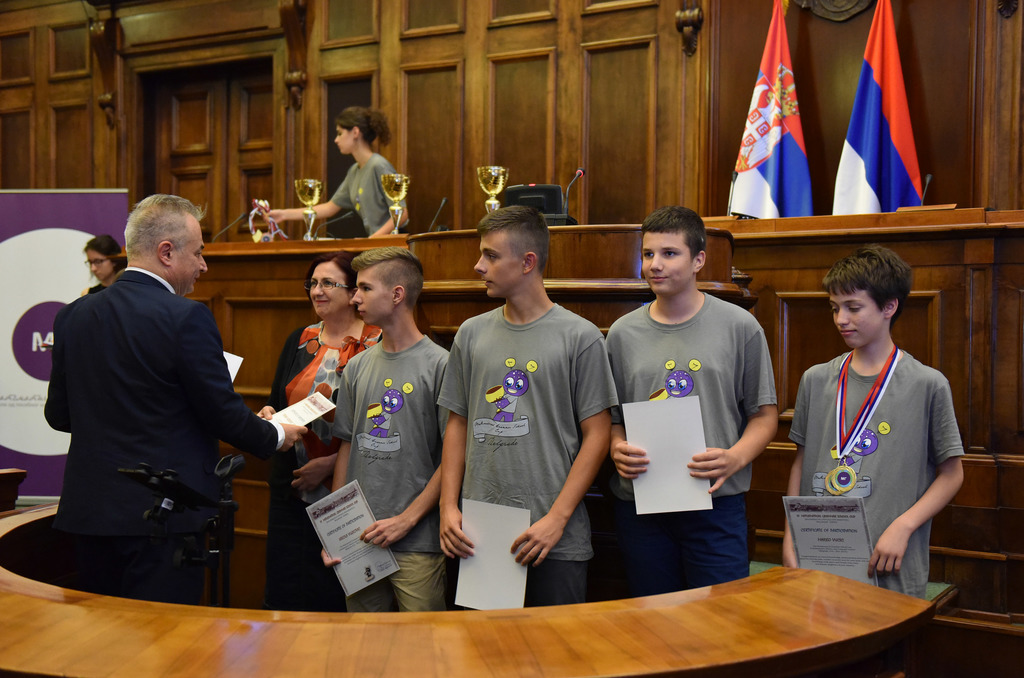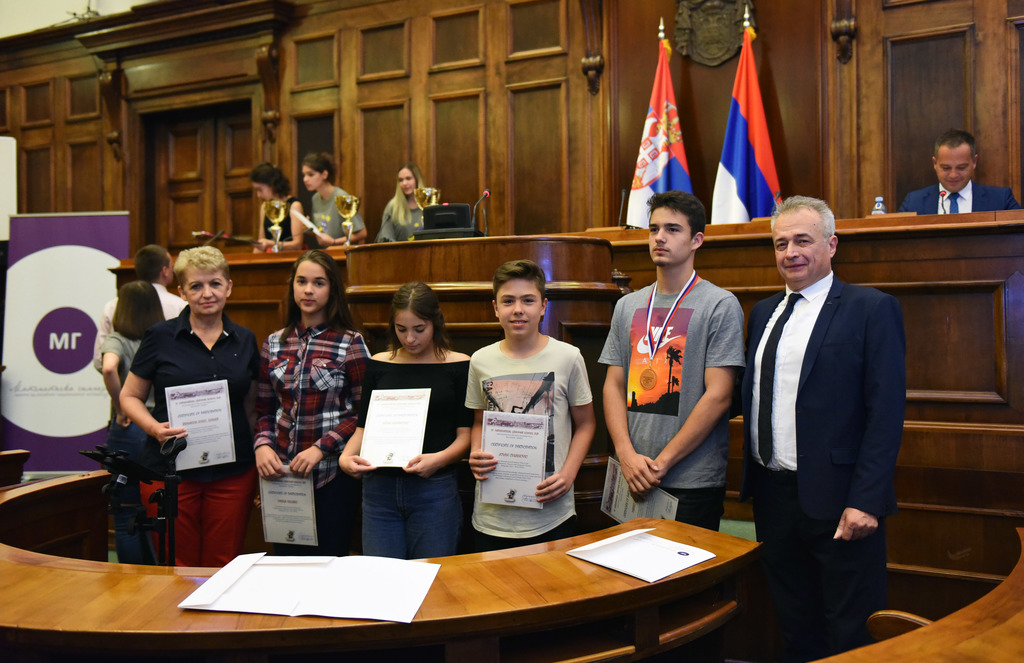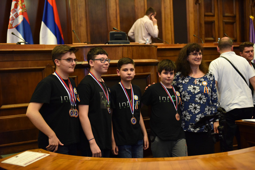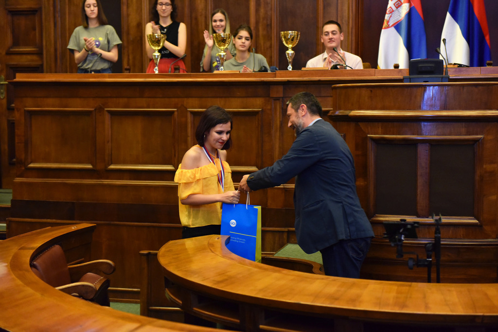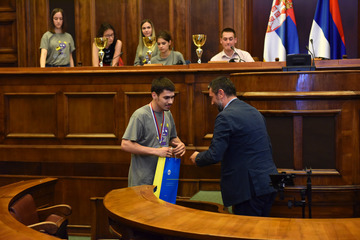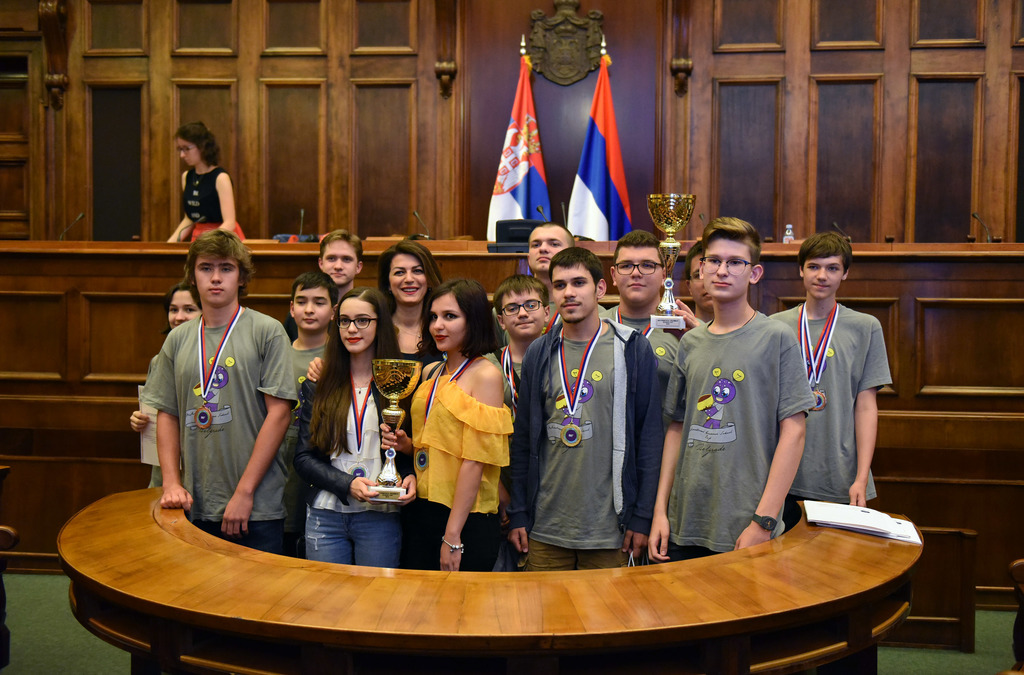 ОпштеМЕЂУНАРОДНА ТАКМИЧЕЊА-фотографијеУ четвртак, 28. јуна 2018. године у Народној скупштини Републике Србије свечано је затворен шести Куп Математичке гимназије. Гостима се обратио директор Срђан Огњановић и госпођа Татјана Матић, државни секретар у Министарству трговине, туризма и телекомуникација, која годинама показује велико разумевање за нашу школу и ову манифестацију. Министарство трговине, туризма и телекомуникација је један од покровитеља Купа, а ове године је и финансијски помогло да се ово такмчење организује. На свечаном затварању подељене су медеље најуспешнијим такмичарима и пехари најуспешнијим тимовима. Најуспешнији тим у области информатике је тим Румунија-4, најуспешнији тим у области физике је тим Русија-1, а најуспешнији тим у области математике је тим Србија-3, састављен од ученика првог разреда МГ. Фирма GDI је спонзорисала награде за три најуспешнија такмичара. Господин Нинослав Митрић, директор GDI уручио је три Самсунг таблета Страхињи Гроздићу (из тима Србија-3, најбољи такмичар у области математике), Михаилу Лебкову (из тима Русија-1, најбољи такмичар у области физике) и Лаури Нани-Руксандри (из тима Румунија-4, најбоља такмичарка у области информатике).