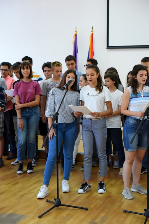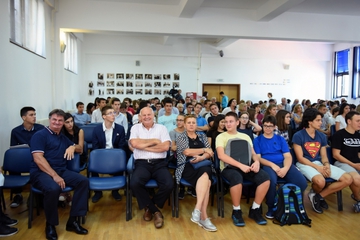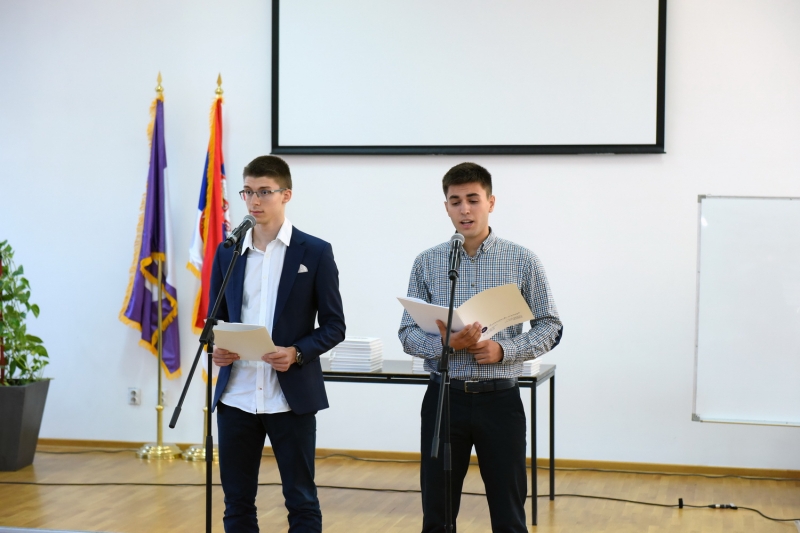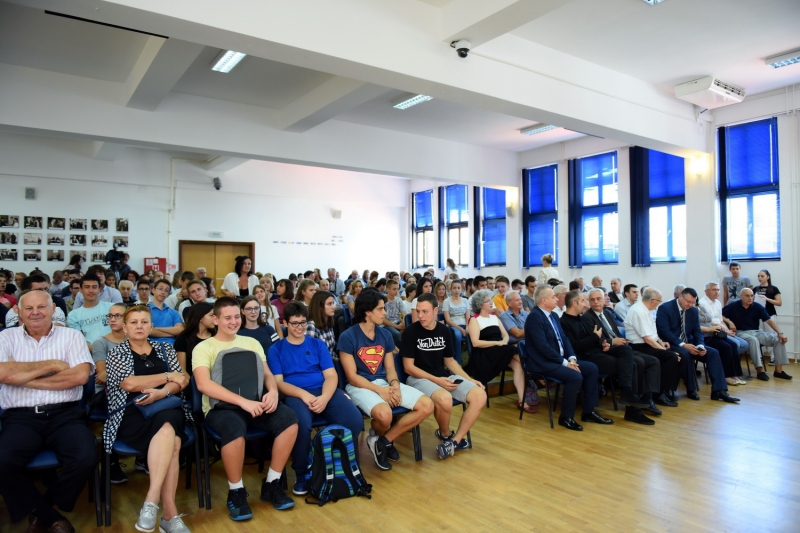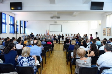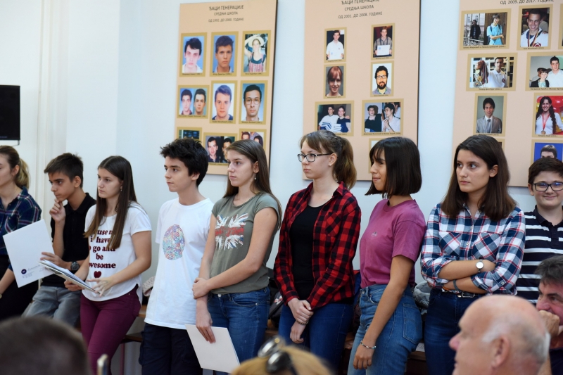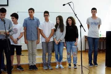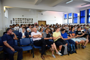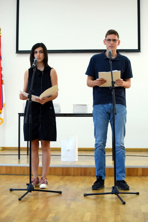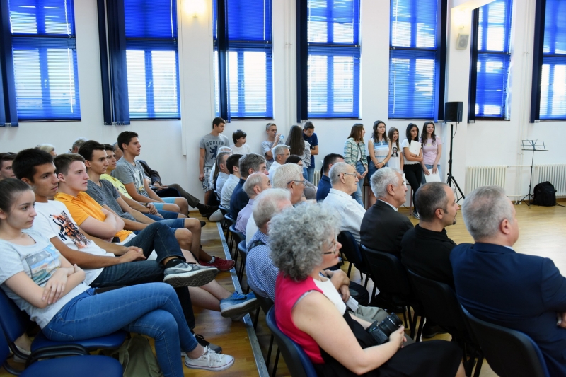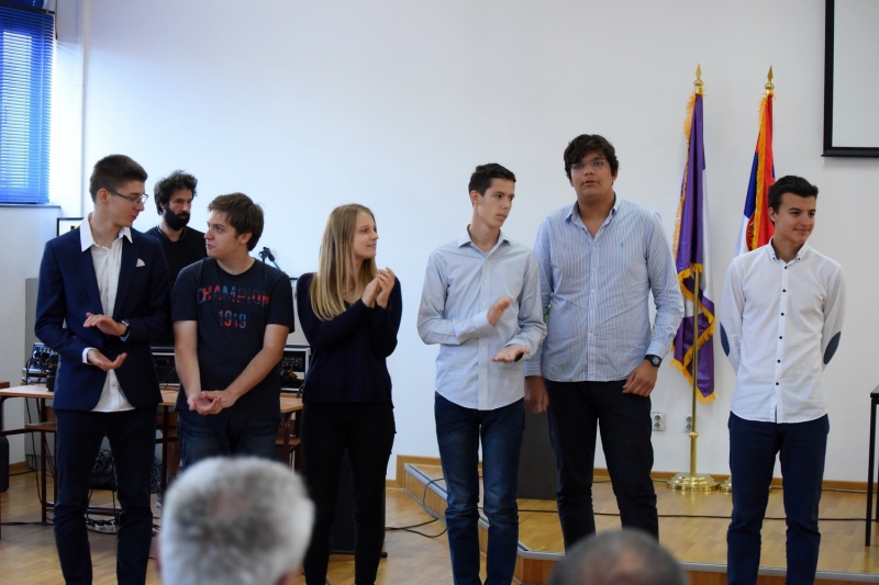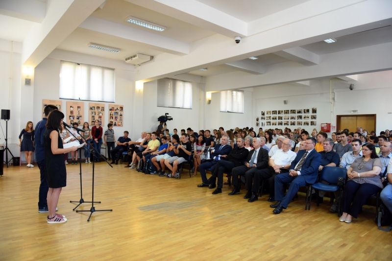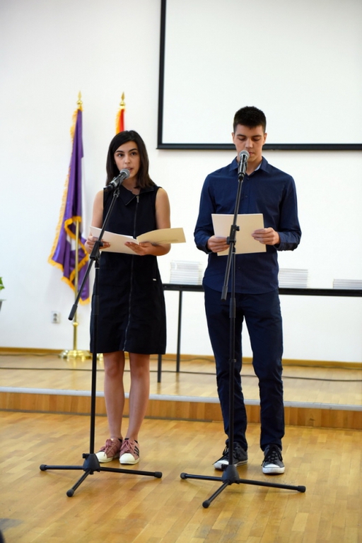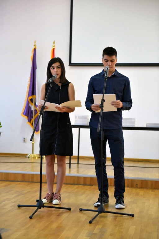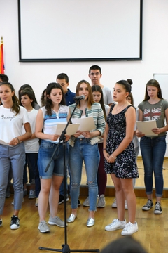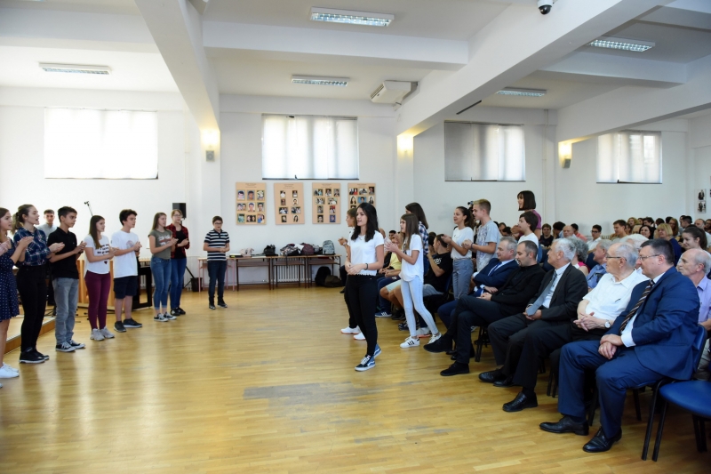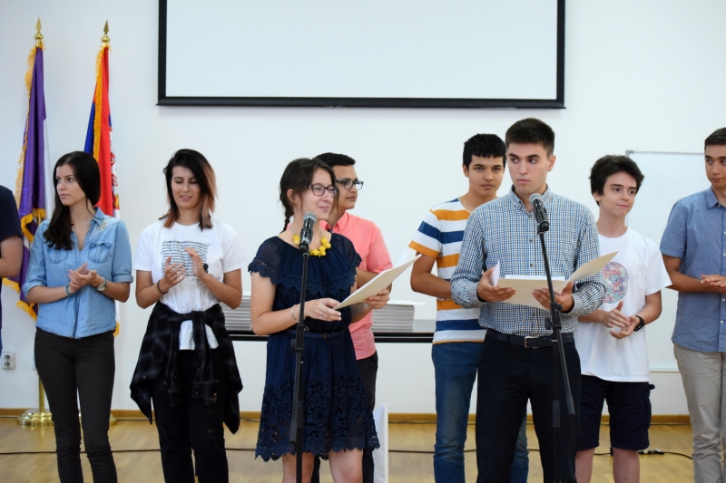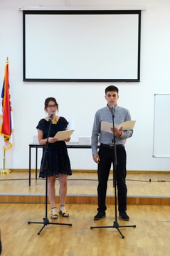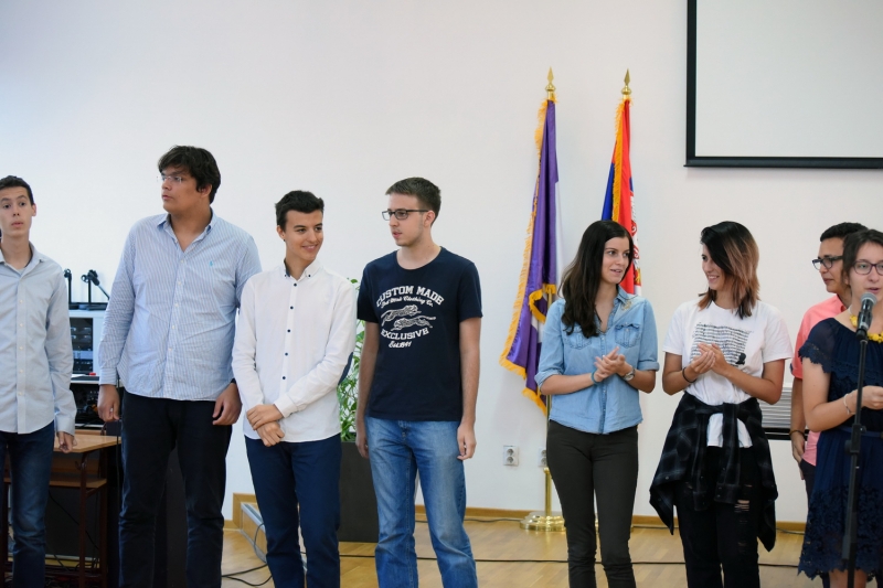 ОпштеДОГАЂАЈИ-фотографијеУ среду, 19. септембра 2018. године ученици и колектив Математичке гимназије прославили су Дан школе у Свечаној сали. Присутне је поздравио директор Срђан Огњановић. И ове године су уручене захвалнице онима који помажу рад МГ и подижу њен углед. Захвалнице су уручене Зорану Станојевићу, новинару РТС-а за дугогодишњу и несебичну подршку у афирмацији Maтематичке гимназије, Лани Вукмировић, ученици трећег разреда за израду логоа Купа МГ и Маши Тиосављевић, ученици четвртог разреда за изузетан и пожртвован однос према Математичкој гимназији. Директор је нашим колегама Милану Чабаркапи и Зорану Николићу уручио поклоне поводом одласка у пензију. Након тога су им ученици отпевали омиљене песме. На крају, гости су поздравили ученике који су освојили медаље на међународним олимпијадама у школској 2017/2018. години. Свечану академију су припремили и извели наши ученици уз помоћ професорке Јелена Нововић.