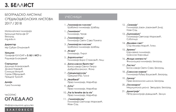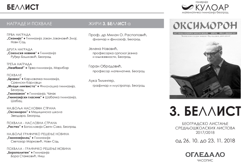 3. БЕЛЛИСТ23. новембар 2018. 16:18:45Галерија КУЛОАР-фотографијеГалерија КУЛОАР3. БЕЛЛИСТ од 26. 10. до 23. 11. 2018 БЕОГРАДСКО ЛИСТАЊЕ СРЕДЊОШКОЛСКИХ ЛИСТОВА 2017/2018. Слике