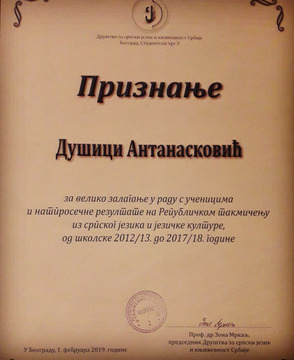 ОпштеНаша професорка Душица Антанасковић добила је признање за велико залагање у раду са ученицима и натпросечне резултате на Републичком такмичењу из српског језика и језичке културе од школске 2012/2013. до 2017/2018. године. Признање је доделило Друштво за српски језик и књижевност Србије.