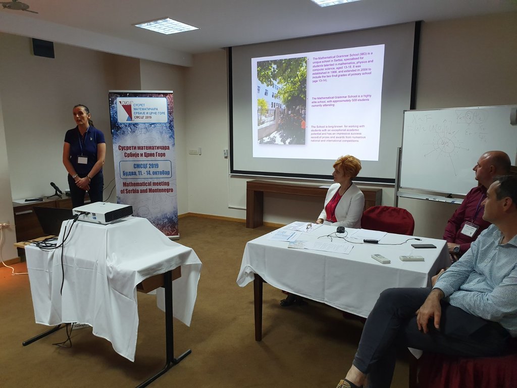 ОпштеМеђународна сарадњаНа симпозијуму "Сусрети математичара Србије и Црне Горе" који се одржао од 11. до 14. октобра 2019. године у Црној Гори (Будва), Мирјана Катић, директор Математичке гимназије представила је рад Математичке гимназије у оквиру панел дискусије "Аспекти и перспективе математичке сарадње Србије и Црне Горе". На симпозијуму је учествовала и наша професорка математике Бојана Матић.