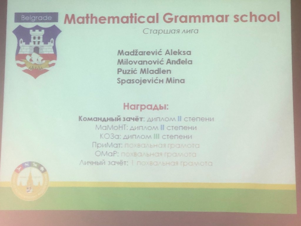 ОпштеМЕЂУНАРОДНА ТАКМИЧЕЊА-фотографијеУченици Математичке гимназије су први пут ове године учествовали на Међународном такмичењу из математичког моделирања одржаног у Русији (Москва) од 27.10. до 03.11. у организацији Advanced Education Science Centre of Moscow State University. Такмичење се састојало из 4 дела - 2 екипна и 2 индивидуална. Такмичило се 22 тима (82 такмичара) из Русије, Кине, Тајланда, Србије…