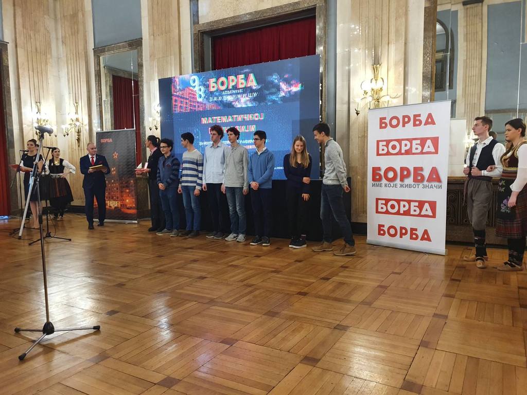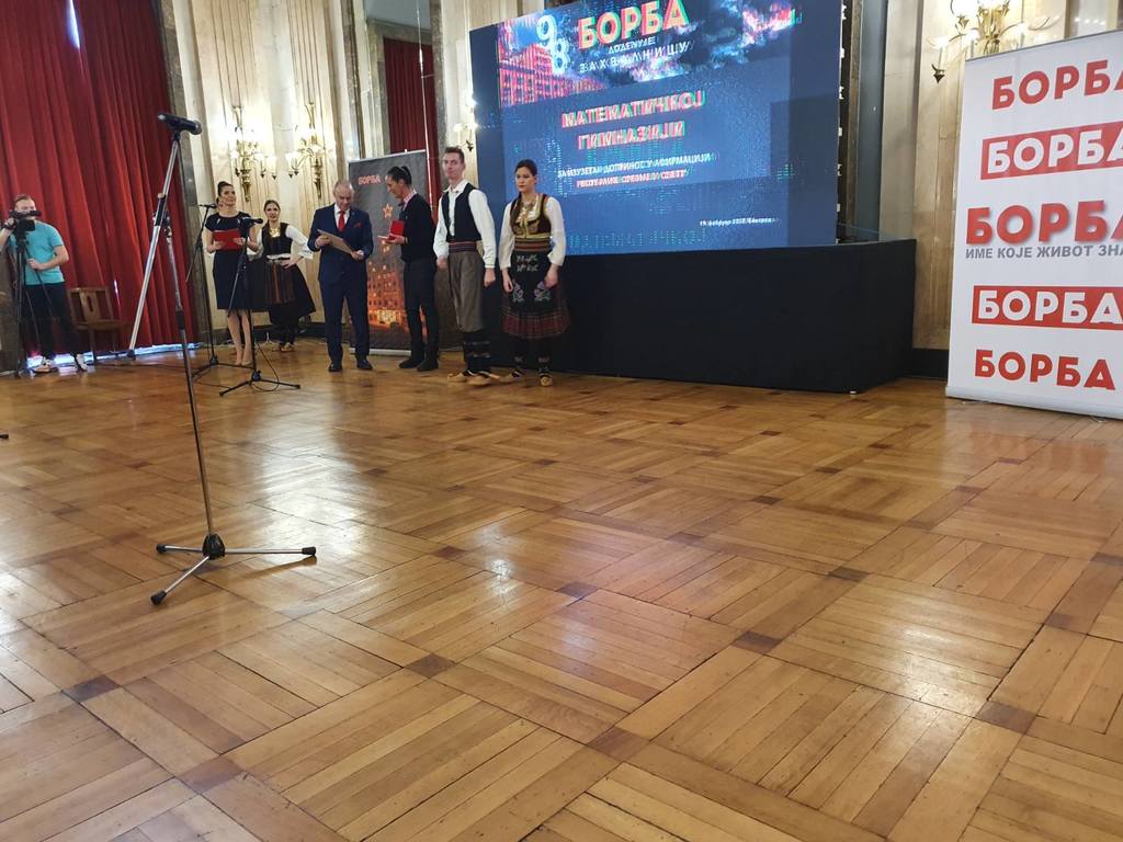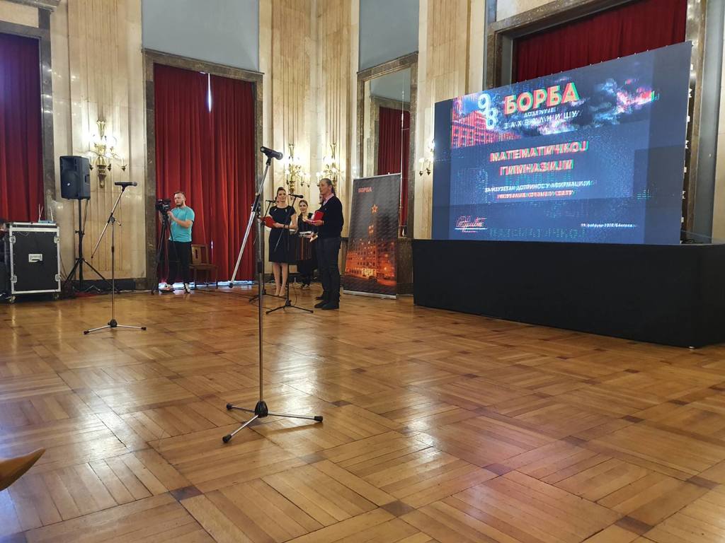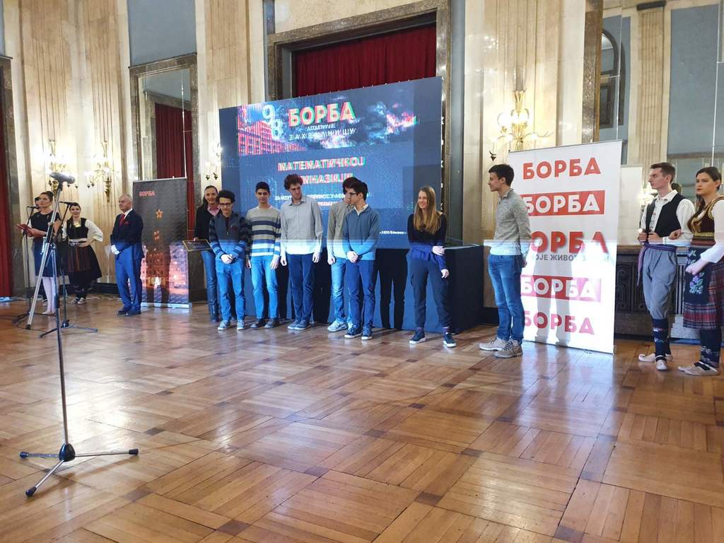 ОпштеДОГАЂАЈИ-фотографијеНАГРАДЕ И ПРИЗНАЊА-фотографијеПоводом обележавања 98 година имена БОРБА у Скупштини града је свечано обележен јубилеј на који су позвани и наши ученици са директорком Мирјаном Катић. Овим поводом Математичкој гимназији је уручена захвалница за изузетан допринос у афирмацији Републике Србије у свету.