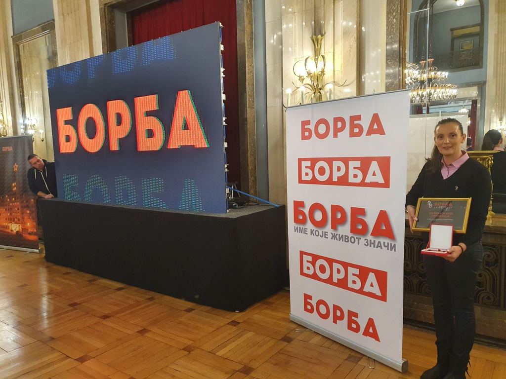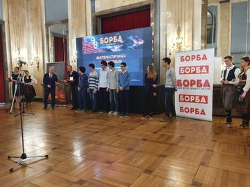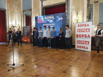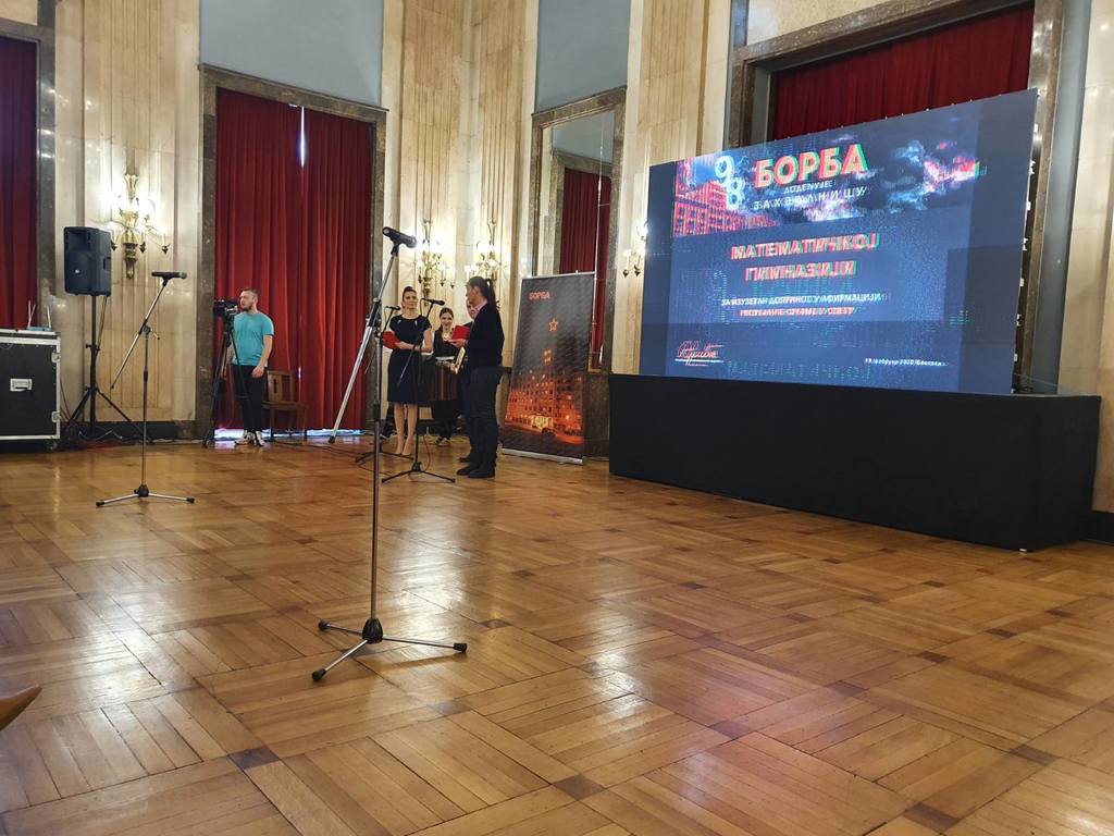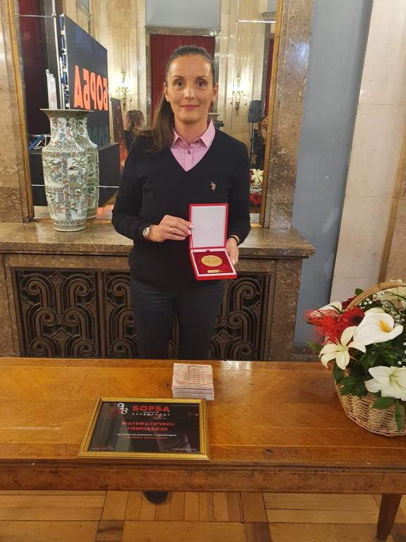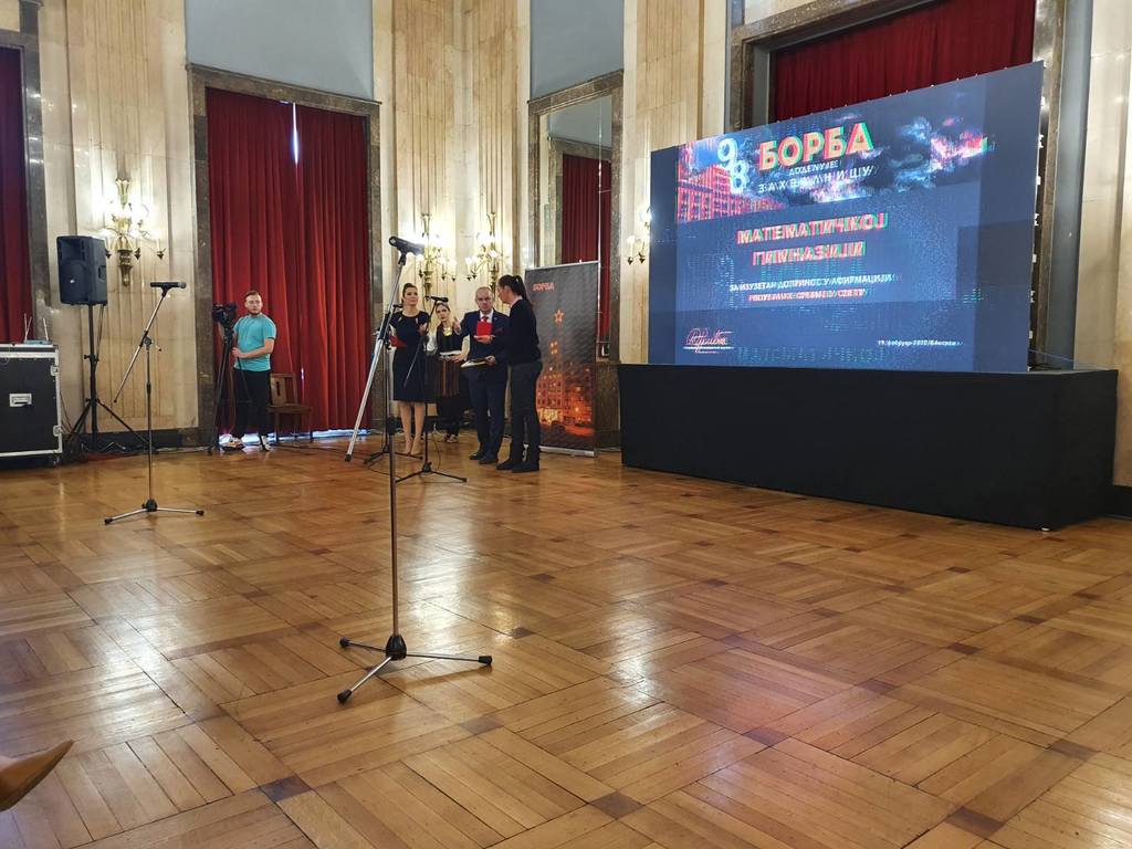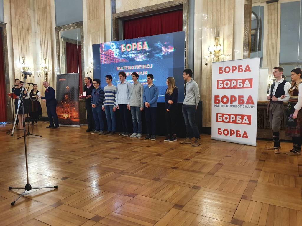 ОпштеДОГАЂАЈИ-фотографијеНАГРАДЕ И ПРИЗНАЊА-фотографијеПоводом обележавања 98 година имена БОРБА у Скупштини града је свечано обележен јубилеј на који су позвани и наши ученици са директорком Мирјаном Катић. Овим поводом Математичкој гимназији је уручена захвалница за изузетан допринос у афирмацији Републике Србије у свету.
