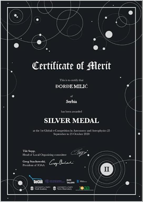 ОпштеМЕЂУНАРОДНА ТАКМИЧЕЊА-фотографијеНа одржаној Међународној онлaјн олимпијади из астрономије и астрофизике (GeCAA) ученици Математичке гимназије су у конкуренцији 279 ученика из 38 земаља освојили три медаље: