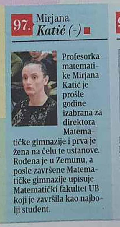 ОпштеДневни лист "Блиц" издао је своју трационалну листу "100 најмоћнијих жена у Србији" - директорка Математичке гимназије, Мирјана Катић је на 97. месту.