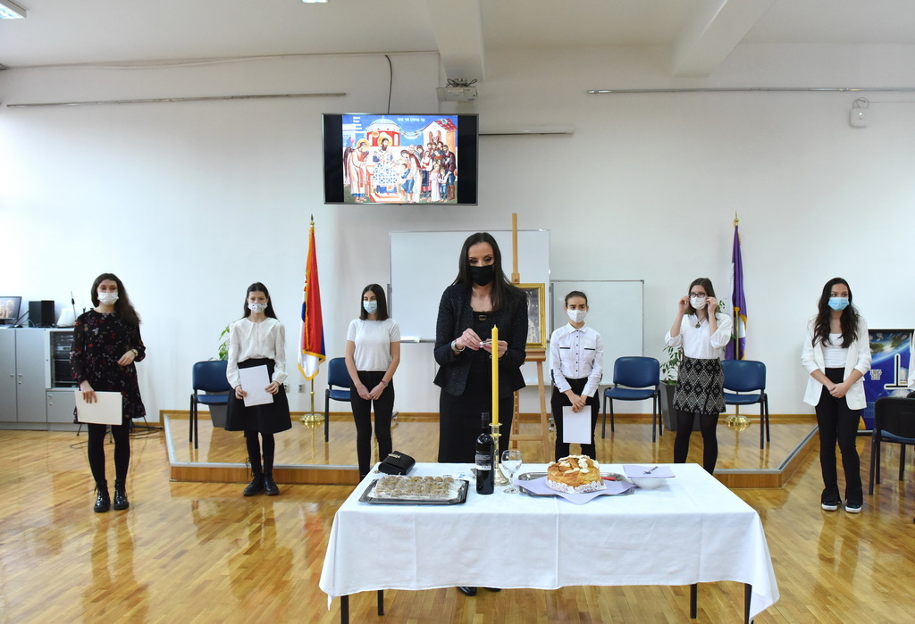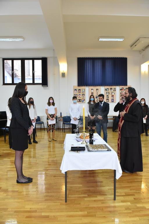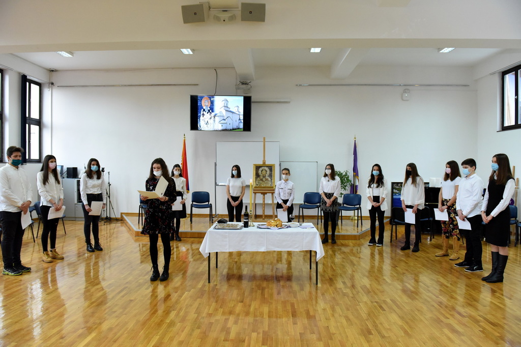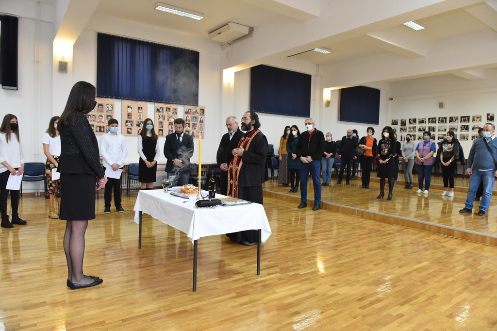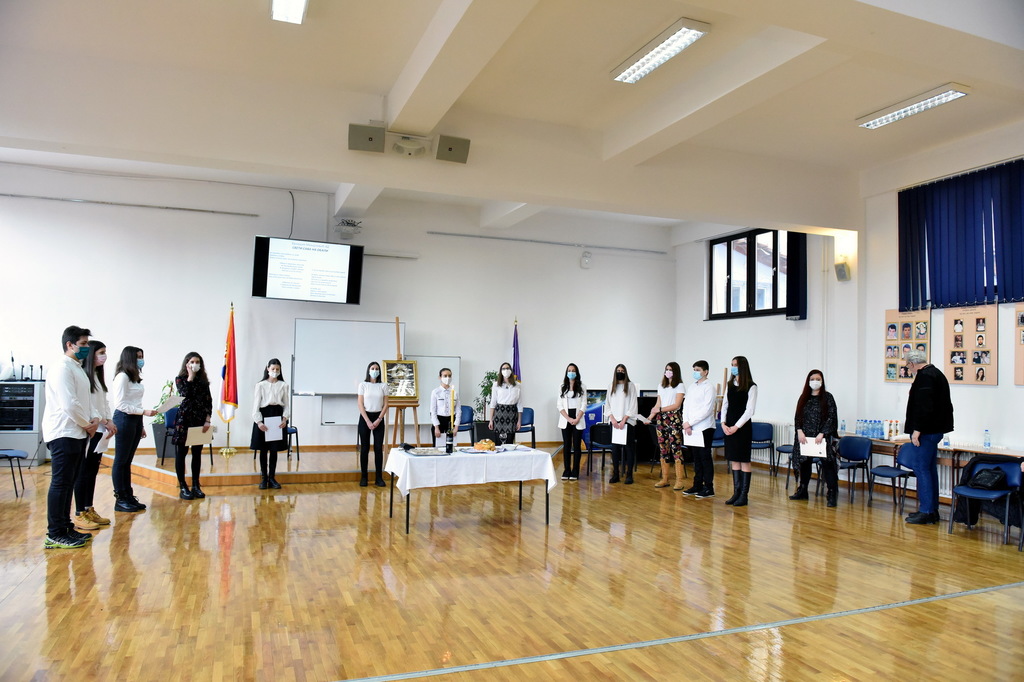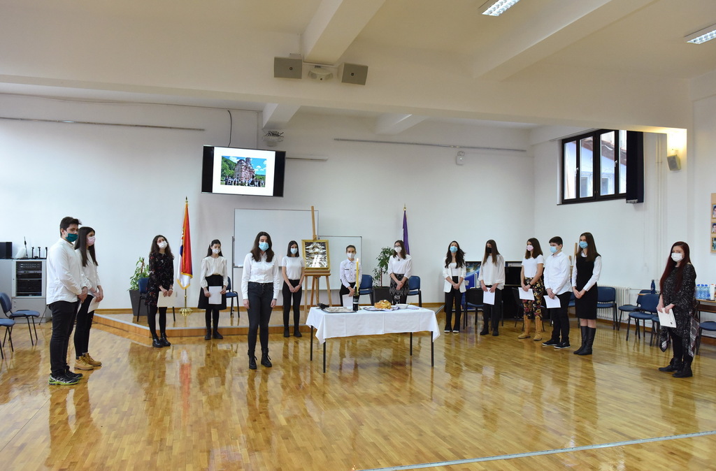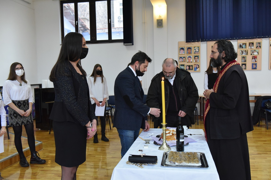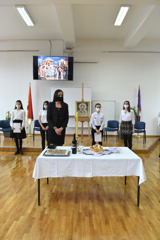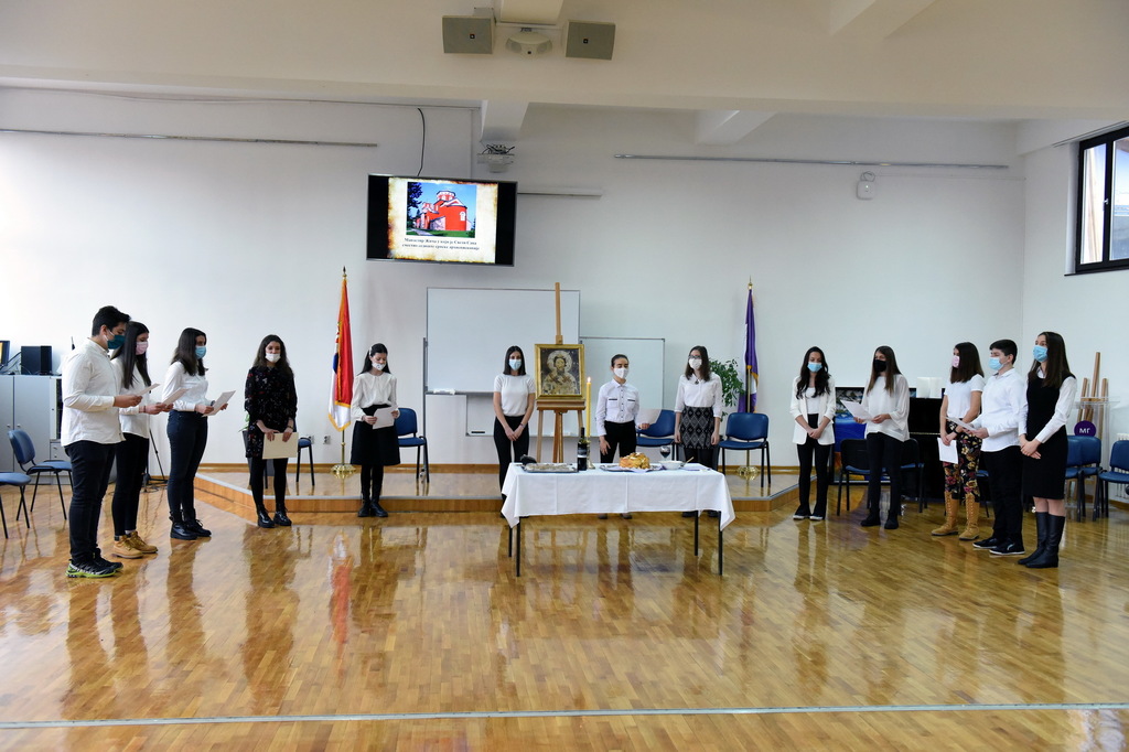 ОпштеДОГАЂАЈИ-фотографијеОве године због тренутне епидемиолошке ситуације нисмо били у могућности да по традицији наше Школе достојно и величанствено, уз Светосавску академију и коктел, заједно окупљени обележимо један од најзначајнијих школских празника. Ученици и запослени у школи, заједно са свештеником Арсенијом Арсенијевићем из Вазнесењске цркве, пресекли су славски колач. Директорка Мирјана Катић је свим присутнима честитала срећну славу и пожелела да је следеће године прославимо у срећнијим околностима. У кратком уметничком програму наступили су ученици МГ. Програм је припремала професорка Јелена Нововић.