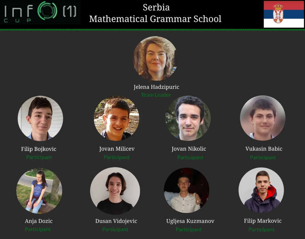 ОпштеМЕЂУНАРОДНА ТАКМИЧЕЊА-фотографијеОд 13 до 14. фебруара 2021. су одржана два кола велике међународне олимпијаде у програмирању Инфо(1) Куп 2021. Домаћин такмичења у онлајн формату је Национални центар изврсности Румуније (Прахова). Учествовало је 233 ученика из 19 земаља са три континента које имају традицију одличних резултата на информатичким олимпијадама.