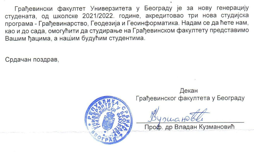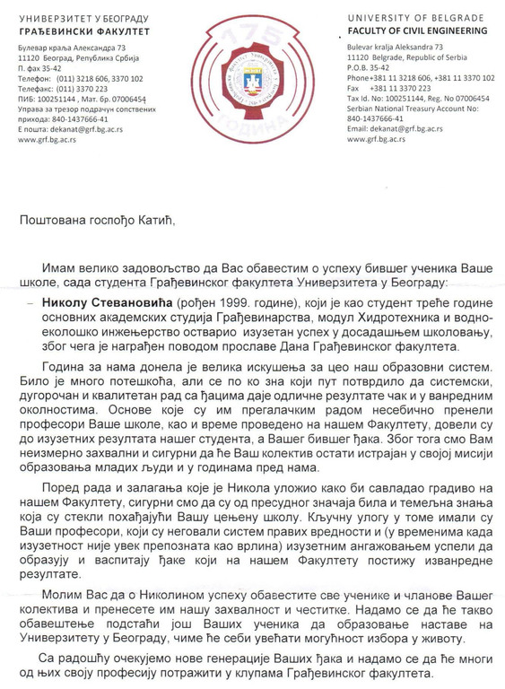 ОпштеПроф. др Владан Кузмановић, декан Грађевинског факултета, упутио је писмо директорки Математичке гимназије у којем је обавештава о успеху нашег бивших ученика, а садашњих студената Грађевинског факултета - Николе Стевановића који је остварио одличне резултате током студирања и због чега је награђен поводом прославе Дана Грађевинског факултета.
