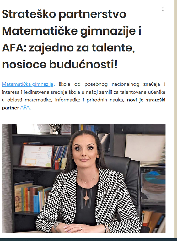 ОпштеМатематичка гимназија, школа од посебног националног значаја и интереса и јединствена средња школа у нашој земљи за талентоване ученике у области математике, информатике и природних наука, нови је стратешки партнер АФА.