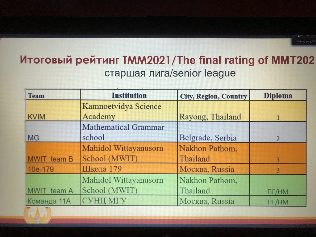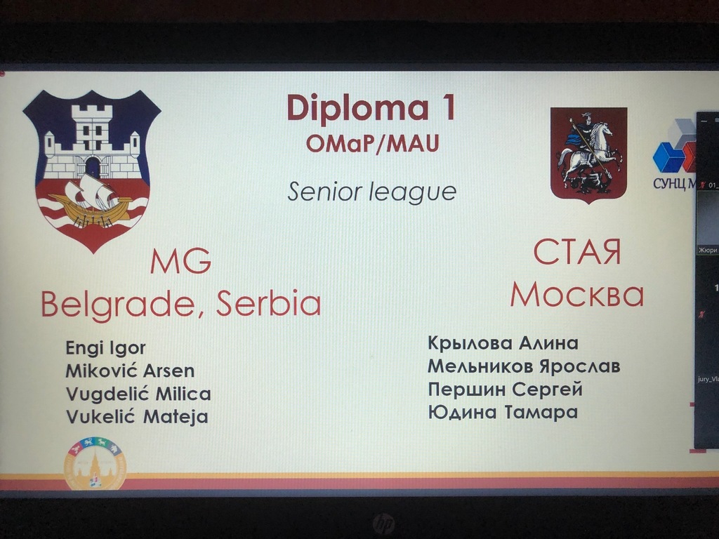 ОпштеМЕЂУНАРОДНА ТАКМИЧЕЊА-фотографијеЕкипа Математичке гимназије, ове године у саставу Игор Енги, Арсен Миковић, Матеја Вукелић и Милица Вугделић, предвођена професорком Иваном Јовановић и ове године је, трећи пут за редом, учествовала на Интернационалном такмичењу математичког моделирања и примењене математике које се одржава у Москви. Због пандемије такмичење је ове године одржано онлине. Такмичило се 30 тимова из 5 земаља и 12 градова. Наша екипа је освојила велики број награда како појединачно тако и екипно: