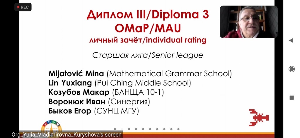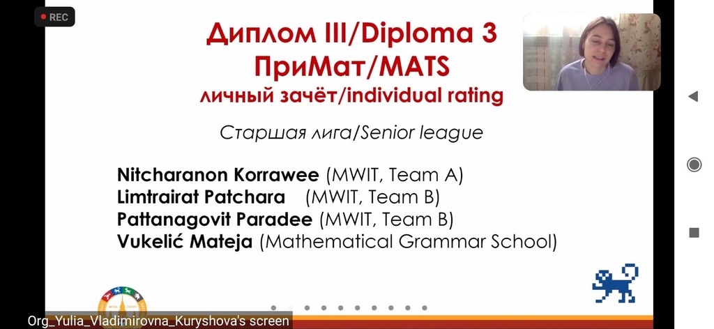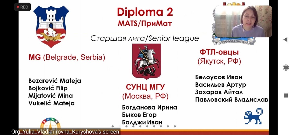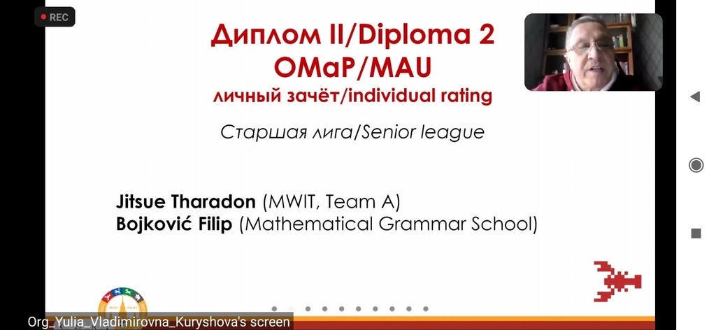 Такмичење се састојало из 2 екипна и 2 појединачна дела. Такмичило се 23 тима (већином четворочлана) из Русије, Кине, Тајланда, Србије… Састав српског тима чинило је четири ученика Математичке гимназије – Матеја Вукелић ученик четвртог разреда и Филип Бојковић, Матеја Безаревић и Мина Мијатовић ученици трећег разреда, у пратњи професорке Иване Јовановић вође екипе.