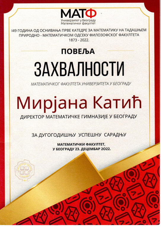 Математички факултет Универзитета у Београду уручио је повељу захвалности Мирјани Катић, директору Математичке гимназије за дугогодишњу сарадњу.