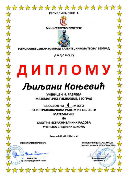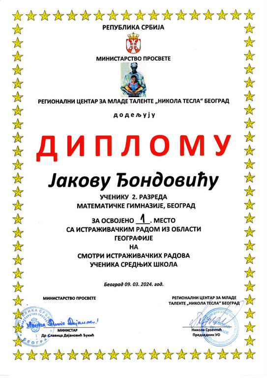 ОпштеТАКМИЧЕЊА У ЗЕМЉИ-фотографијеНа недавно одржаној Републичкој смотри истраживачких радова ученика средњих школа, ученици наше школе Љиљана Kоњевић и Јаков Ђондовић остварили су запажене резултате. За финални ниво такмичења пласирало се 92 ученика средњих школа са својим истраживачким радовима у осам научних дисциплина, међу којима и ученици Математичке гимназије.