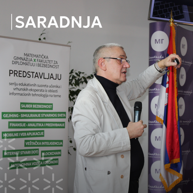 ОпштеСеминари и предавањаСарадња Математичке гимназије и Факултета за дипломатију и безбедност започела је првим у низу планираних едукативбних сусрета ученика и врхунских експерата у области Информационих технологија. Циљ предавања је упознавање ученика са темама које су од суштинског значаја за непосердну будућност, као што су сајбер безбедност, гејминг- симилирање стварног света, финансије – аналитика и предвиђање, мобилне и веб апликације, вештачка интелигенција, интернет ствари (IOT), аутономна возила и дронови, блокчејн.