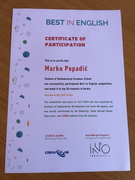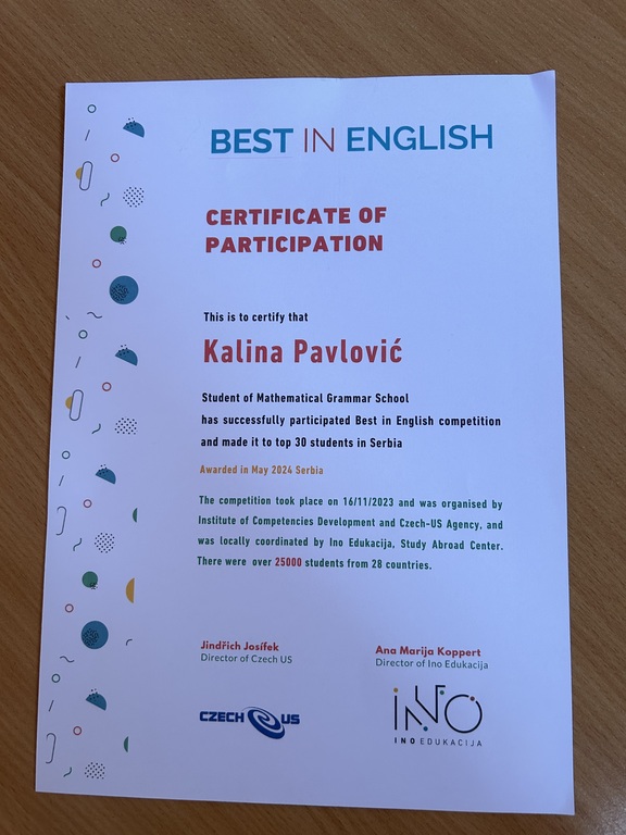ОпштеДОГАЂАЈИ-фотографијеУ понедељак 20. маја 2024. године школу је посетила Тијана Ђурковић, представница Иноедукације како би награђеним ученицима и наставници доделила сертификате за постигнут успех на такмичењу Best in English.