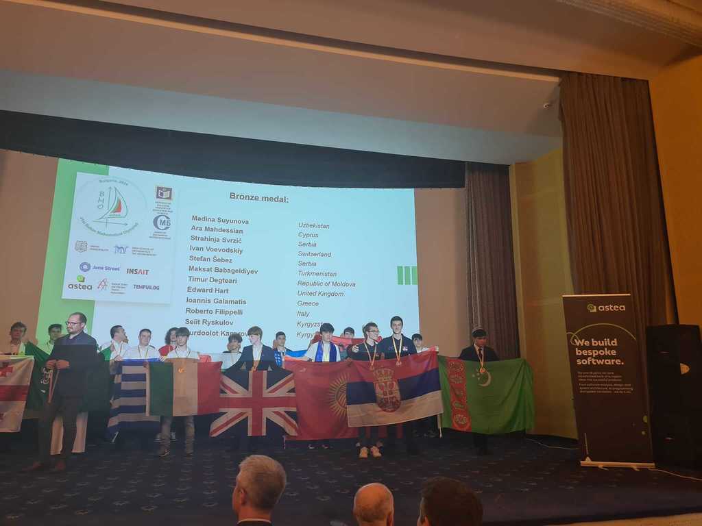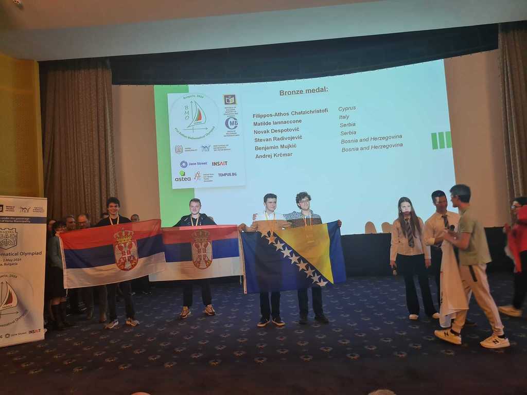 ОпштеМЕЂУНАРОДНА ТАКМИЧЕЊА-фотографијеНа 41. Балканској математичкој олимпијади (Balkan Mathematical Olympiad – BMO), која је одржана од 27. априла до 2. маја 2024. године у Варни, Бугарска, а која је једно од најзначајнијих средњошколских математичких такмичења, свих шест чланова тима Србије освојили су по бронзану медаљу.