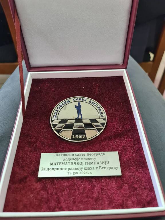 ОпштеНАГРАДЕ И ПРИЗНАЊА-фотографијеУ петак, 28. јуна 2024. године поводом прославе Дана Шаховског савеза Београда, Математичкој гимназији уручена је плакета за развој шаха у Београду.