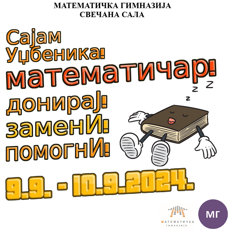 ОбавештењаПозивамо вас да учествујете на Сајму уџбеника који ће се одржати 9. и 10. септембра 2024. од 15 часова у свечаној сали Математичке гимназије.