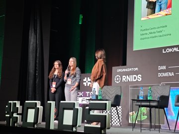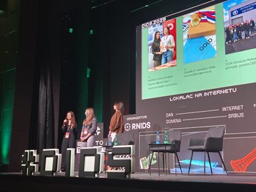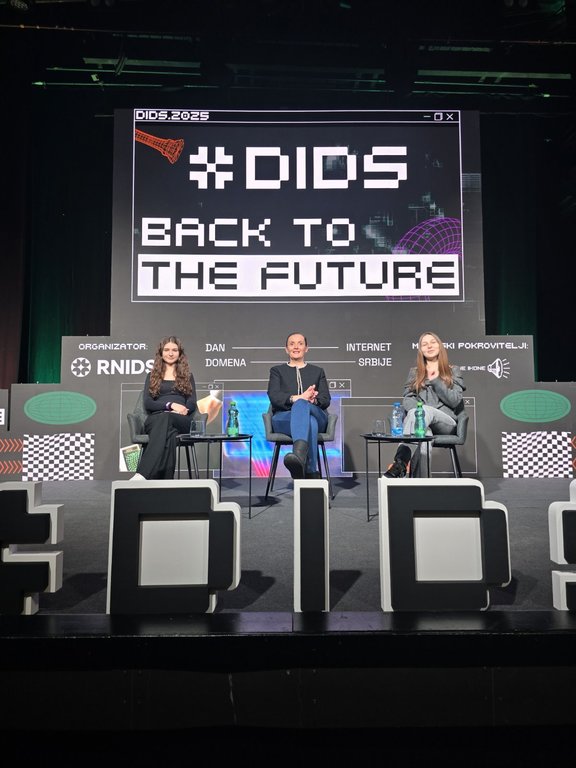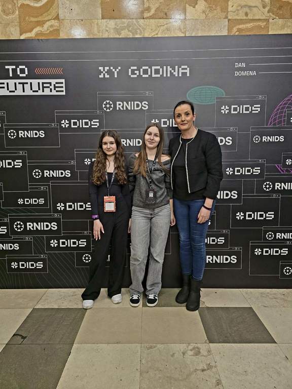 ОпштеДОГАЂАЈИ-фотографијеУченице Софија Крсмановић и Вања Јеловац, заједно са директором Мирјаном Катић, учествовале су на конференцији ДИДС 2025 (Дан интернет домена Србије), која је одржана 18. марта 2025. године у Дому омладине Београда.