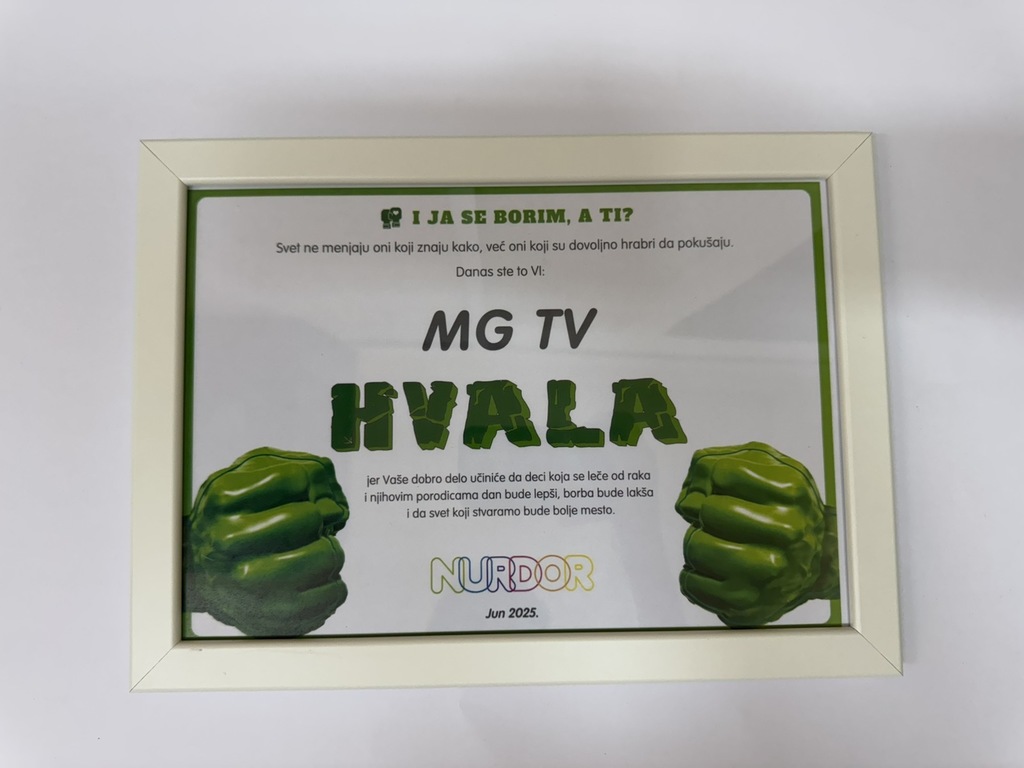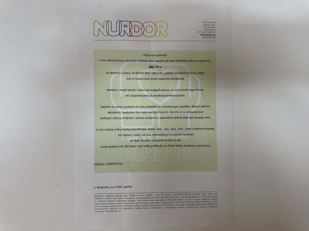 ОпштеДОГАЂАЈИ-фотографијеНакон премијере документарног филма „Сећање на Михајла Спорића“, у организацији МГ ТВ-а, прикупљено је укупно 99.870 динара и 130 евра за подршку деци оболелој од рака. Са дубоком захвалношћу свима који су учествовали у овој акцији, обавештавамо вас да је донација званично уручена удружењу НУРДОР. У име МГ ТВ-а средства су предали Светлана Јакшић, Димитрије Момић и Доситеј Јовановић.