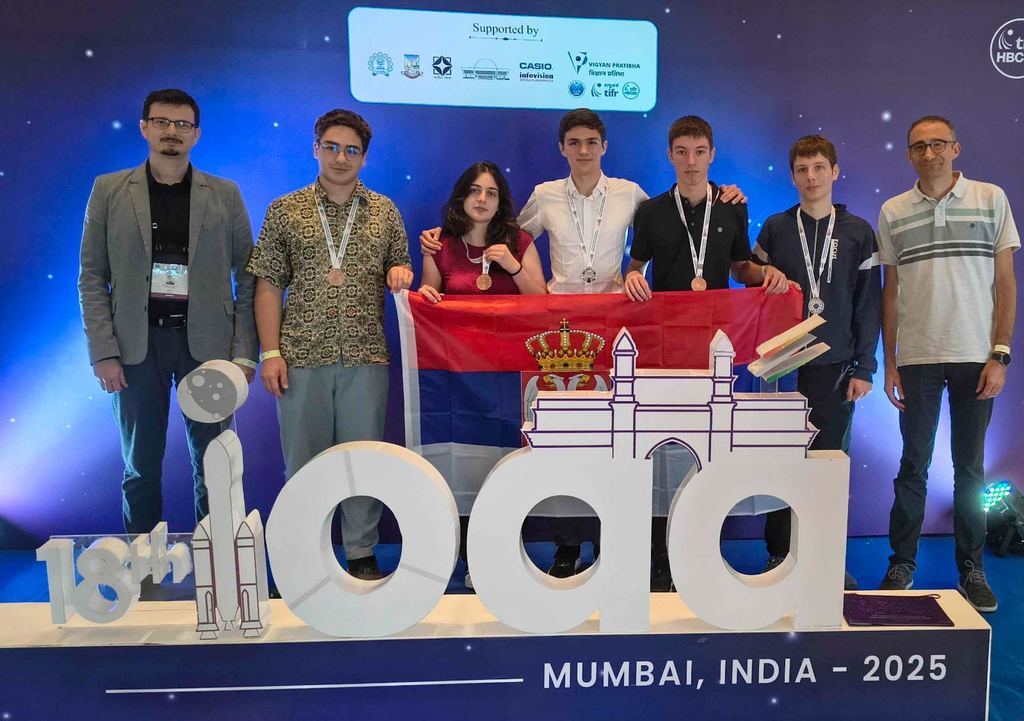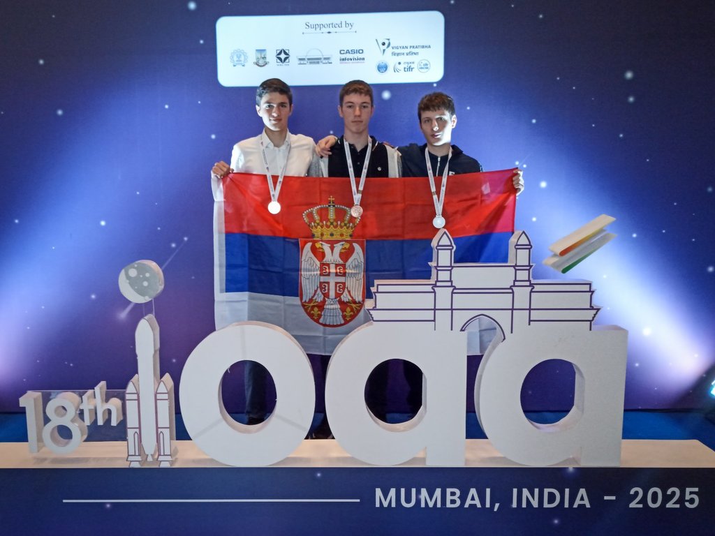 ОпштеМЕЂУНАРОДНА ТАКМИЧЕЊА-фотографијеНа 18. Међународној олимпијади из астрономије и астрофизике (IOAA), која је одржана у Мумбају, Индија, од 11. до 21. августа 2025. године, тим Србије постигао је изузетан успех! После више година без медаља, наши млади астрономи враћају се у Србију са укупно пет медаља. Освојене награде: