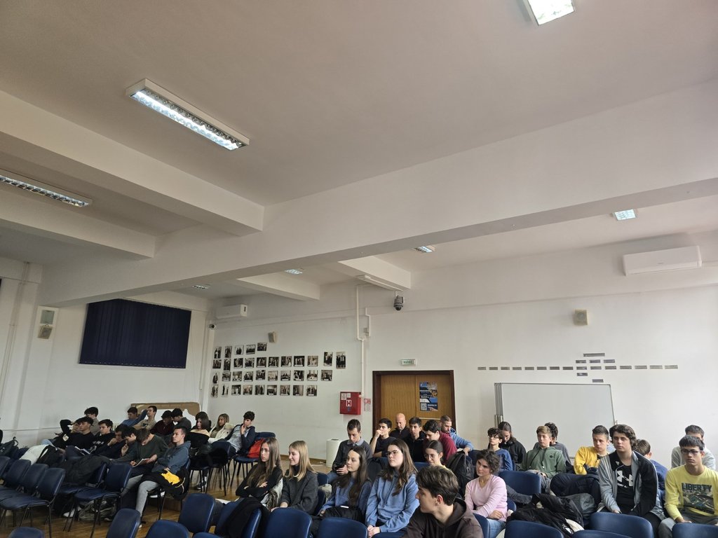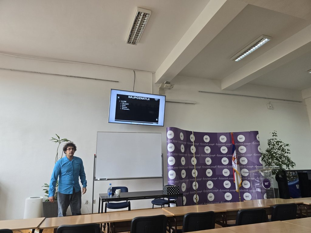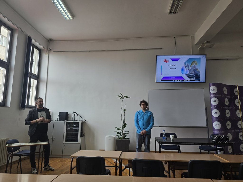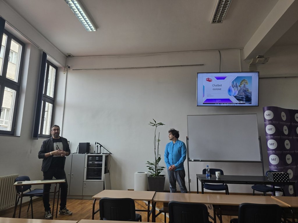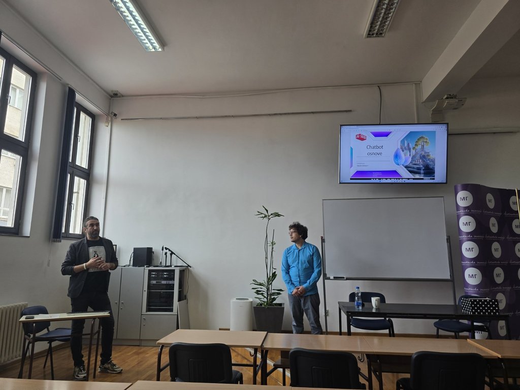 Гости су били Давид Јовановић, оснивач nabavkAI, и Далибор Мариновић из Савеза за вештачку интелигенцију, који су ученицима приближили како настају модерни chatbot-ови, које технологије стоје иза њих и куда се креће развој АИ алата.