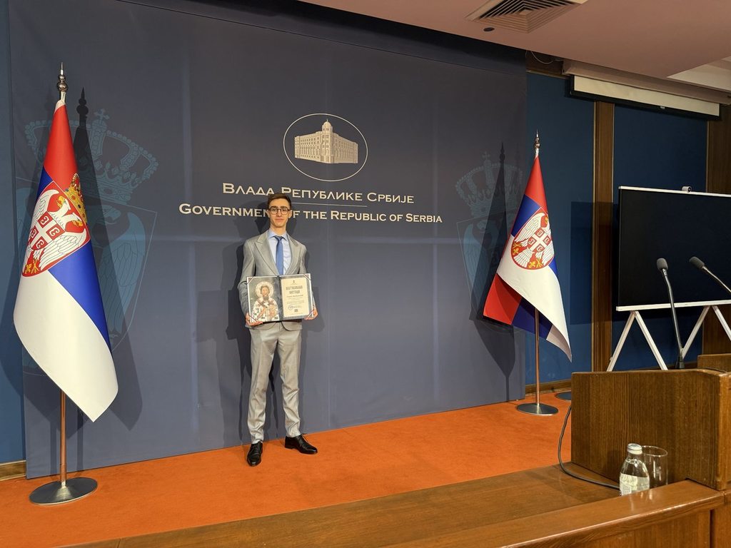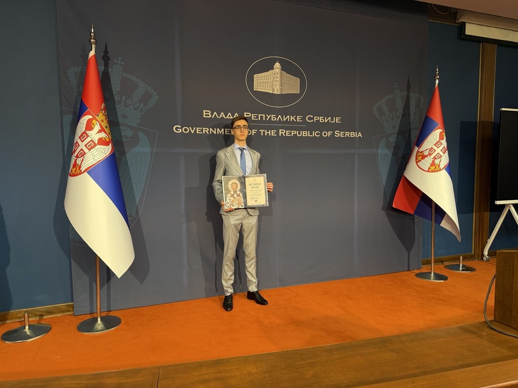 ОпштеДОГАЂАЈИ-фотографијеАндреј Дробњаковић, матурант Математичке гимназије, добитник је Светосавске награде за 2025. годину, која му је додељена за промоцију научног идентитета Србије кроз изузетне резултате на међународним и државним такмичењима.