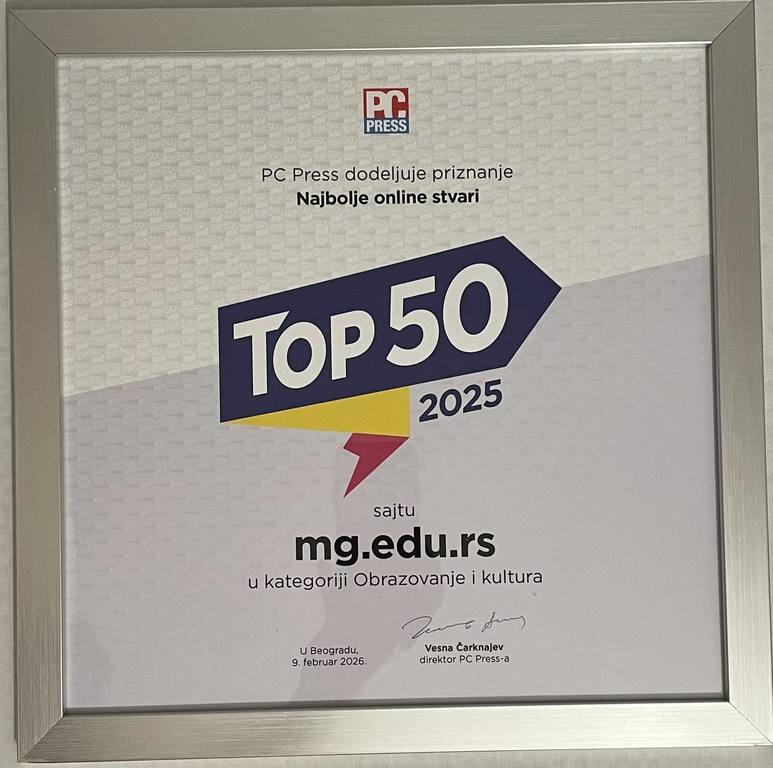 ОпштеДОГАЂАЈИ-фотографијеНАГРАДЕ И ПРИЗНАЊА-фотографијеСајт Математичке гимназије добитник је признања у оквиру 29. избора Top50 – најбоље online ствари, у категорији Образовање и култура, у организацији PC Press.