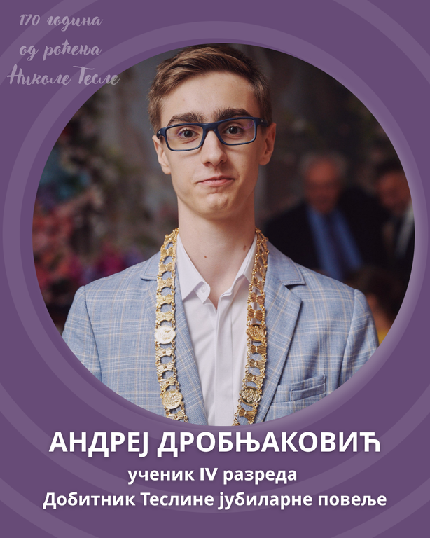 Исту повељу добио је и Андреј Дробњаковић, ученик четвртог разреда Математичке гимназије, као признање за свој рад и достигнућа која доприносе неговању Теслиних вредности међу младима.